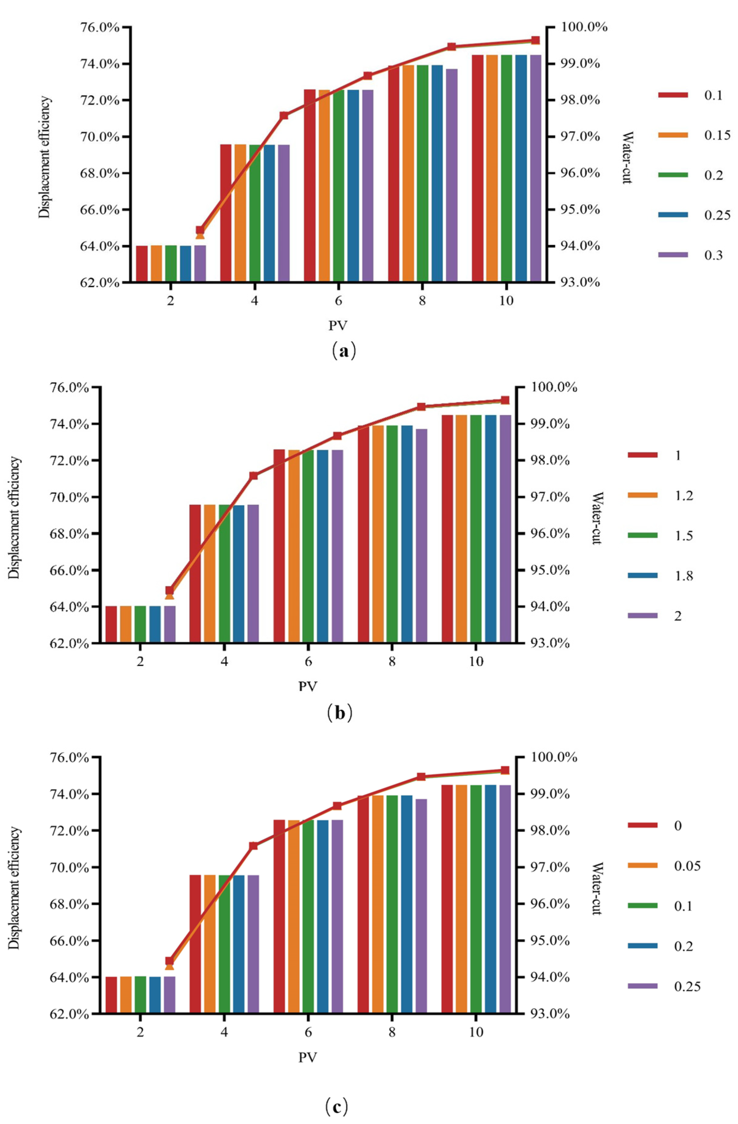 The relation between water cut and displacement efficiency under (a) various IPVs (0, 0.05, 0.15, 0.20, and 0.25) and a constant RRF of 1.5; (b) various RRFs (1, 1.5, 1.8, and 2) and a constant IPV of 0.05; (c) various polymer adsorption indices (0, 0.05, 0.15, 0.20, and 0.25).