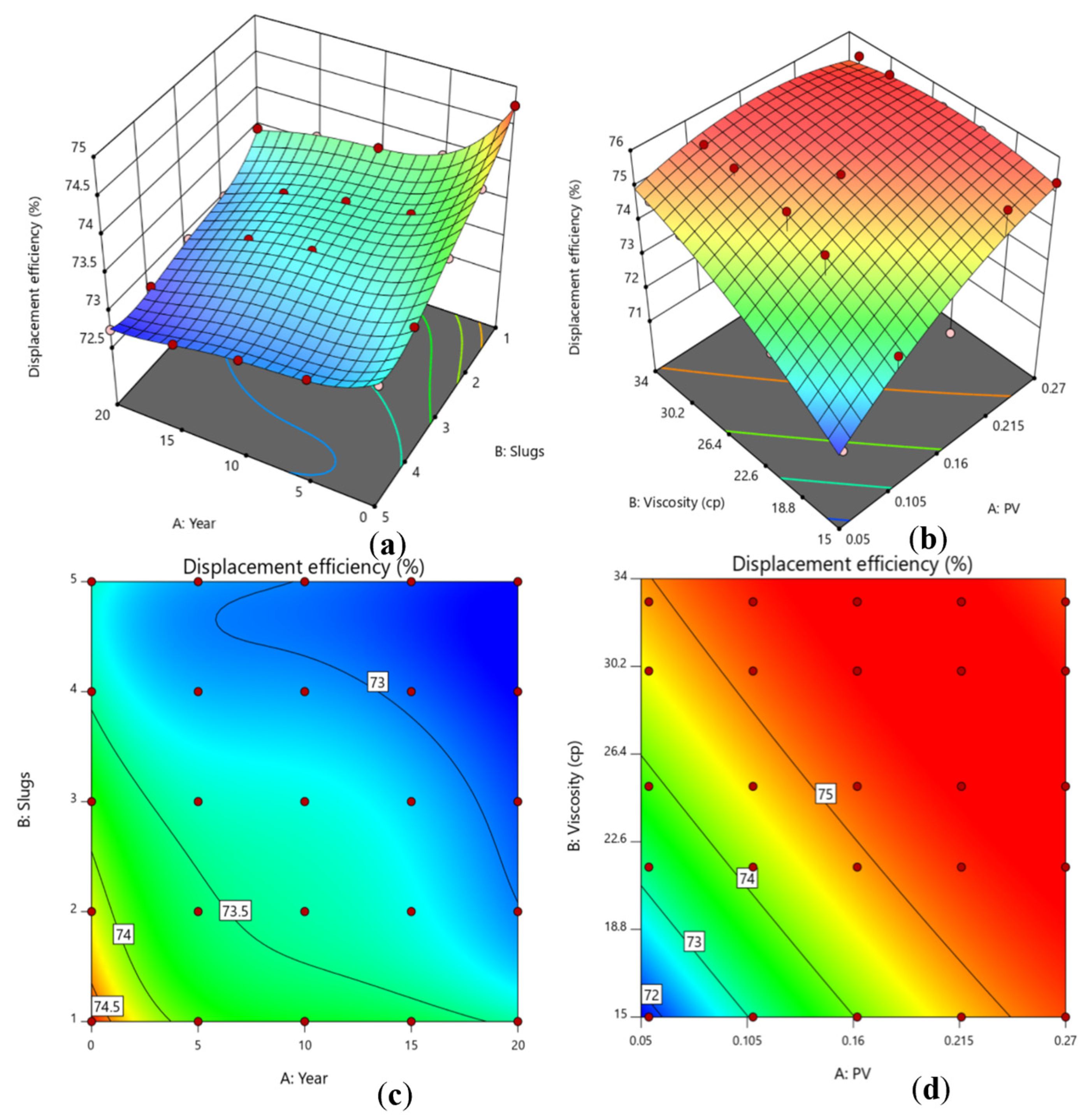 Two-factor comparison of physical fluid properties: (a) slug transition timing and slug response surface; (b) polymer slug volume and viscosity response surface; (c) slug transition timing and slug contour plot; (d) polymer slug volume and viscosity contour plot.