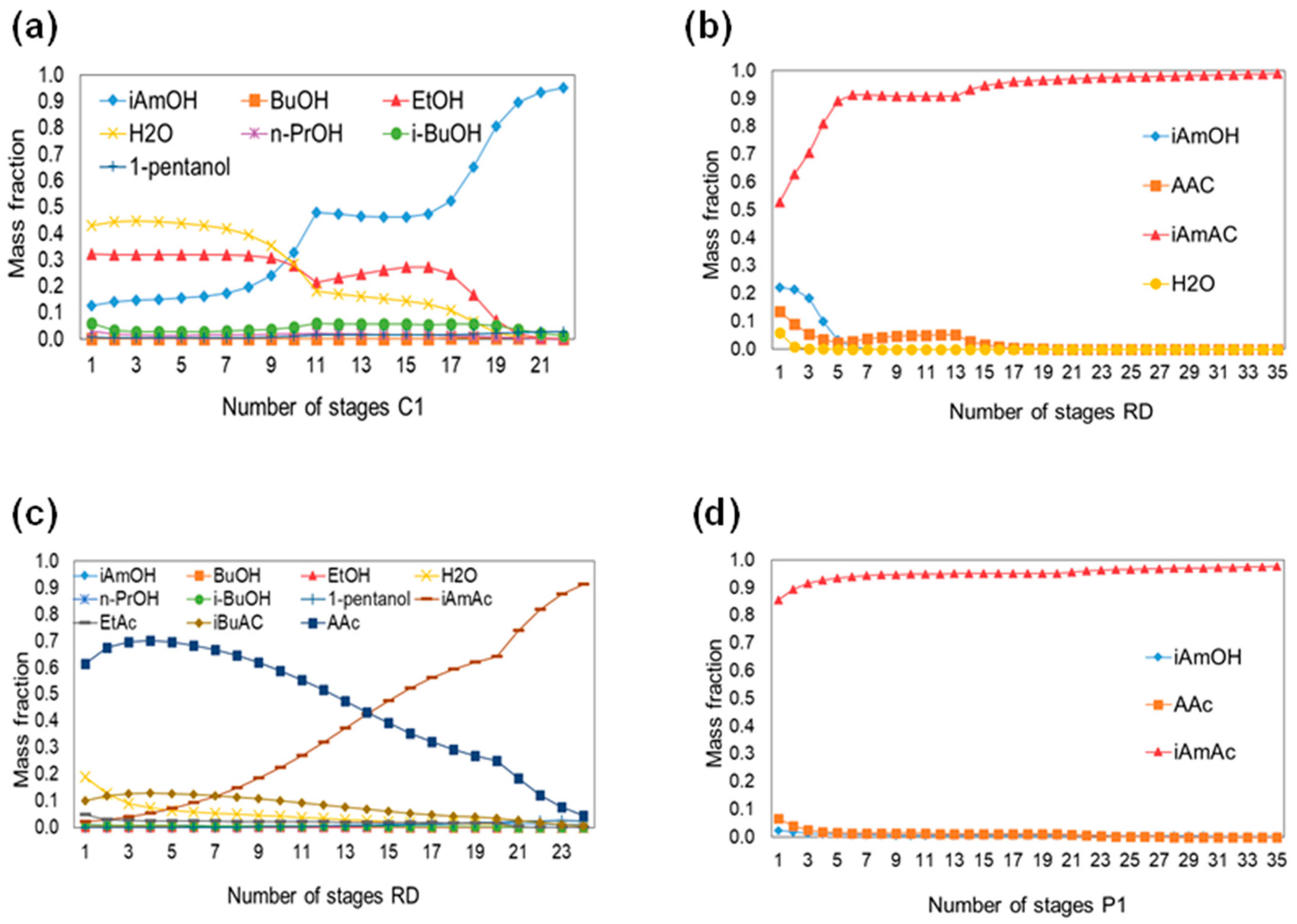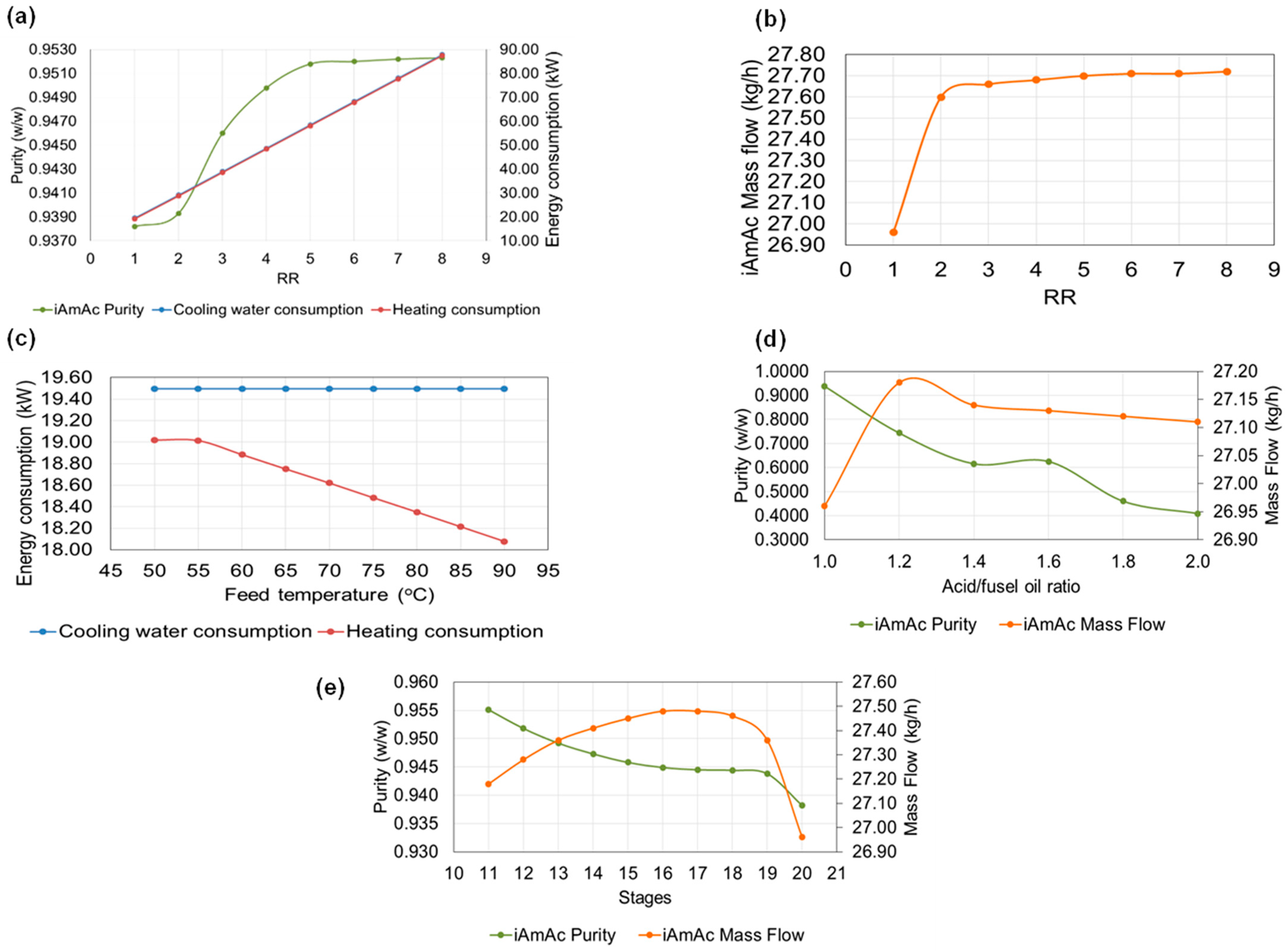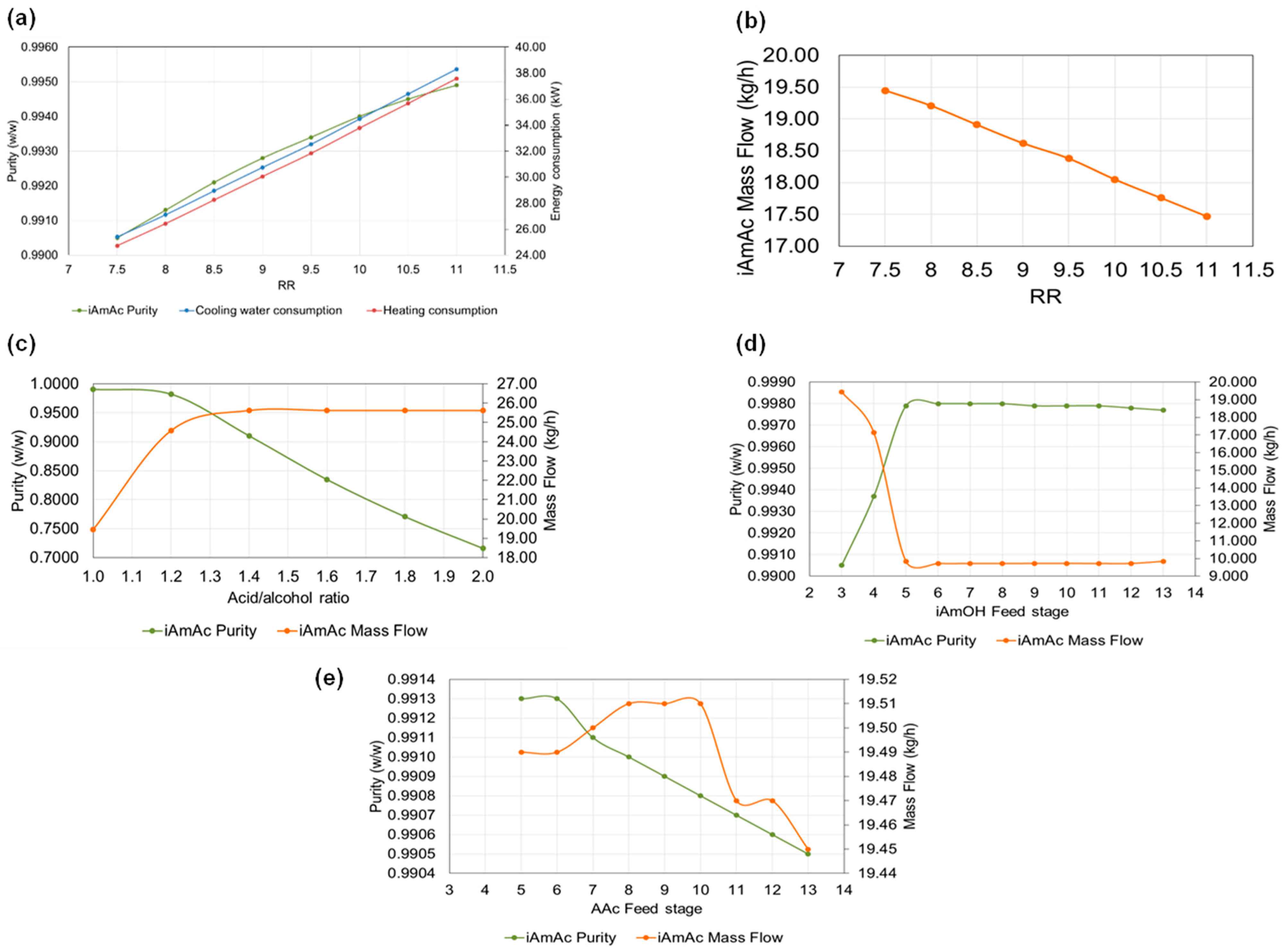 | Case | RR | AAc/ Alcohol Ratio | iAmOH Feed Stage | AAc Feed Stage | Purity (w/w) | iAmAc Mass Flow Rate (kg/h) | Total Consumption (kW) |