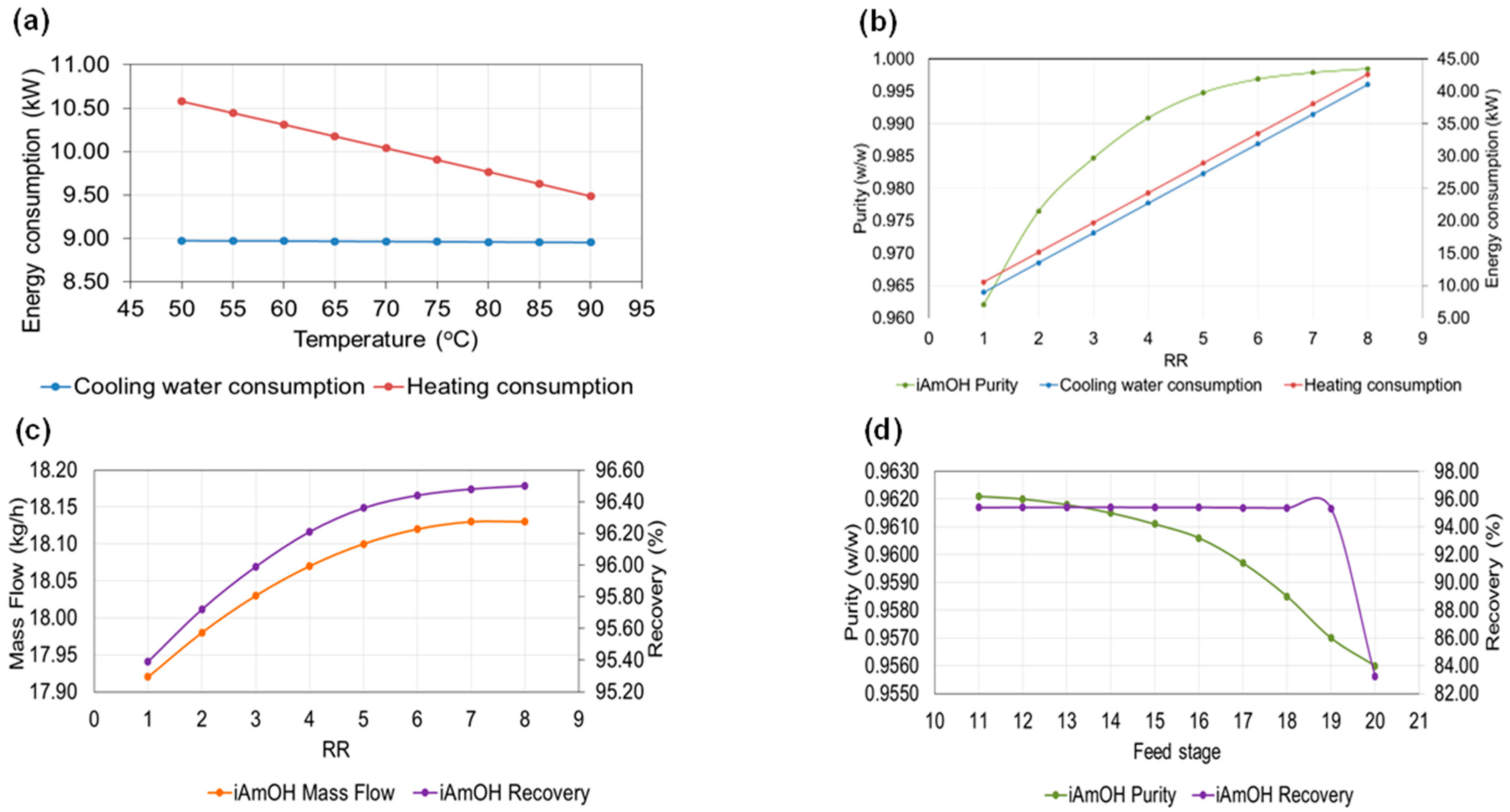 | Case | RR | AAc/ Fusel Oil Ratio | Feed Stages | Fusel Oil Feed Temperature (°C) | Purity (w/w) | Mass Flow Rate iAmAc (kg/h) | Total Consumption (kW) |