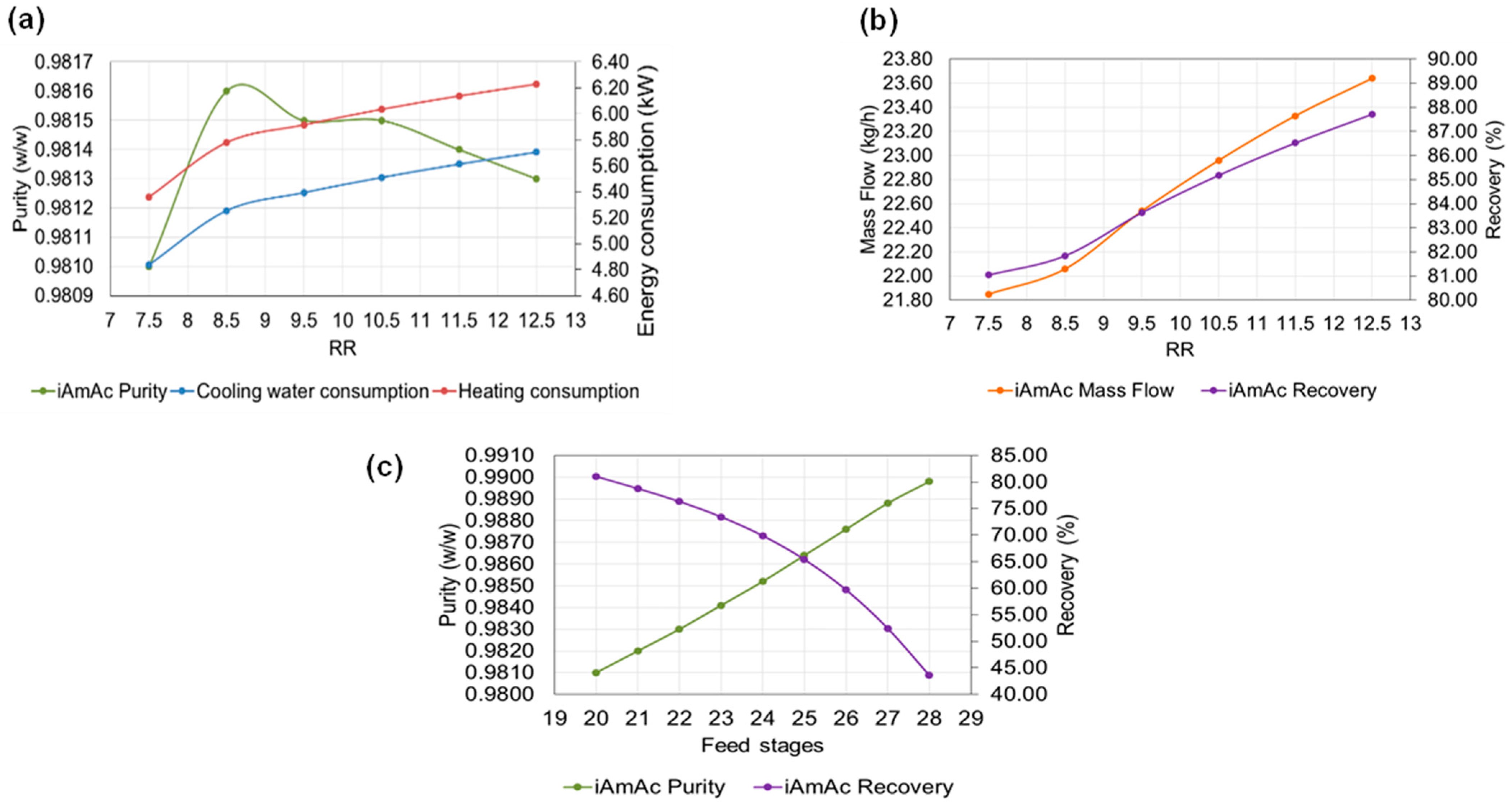 | Case | RR | Feed Stages | Purity (w/w) | iAmAc Recovery (%) | Mass Flow Rate iAmAc (kg/h) | Total Consumption (kW) |