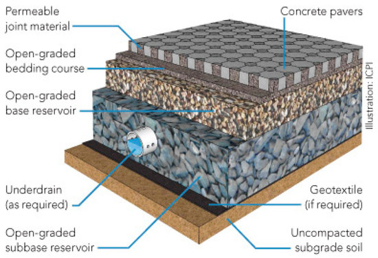 The accompanying Figure 3 elucidates permeable pavers, presenting a cross-sectional view that depicts the subterranean layers alongside their under-drainage systems. This mechanism delineates the operational principles of eco-friendly pavers when juxtaposed with conventional pavers, the latter of which typically lack these integral voids and spacing within their tile structure [7,17].