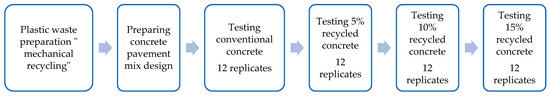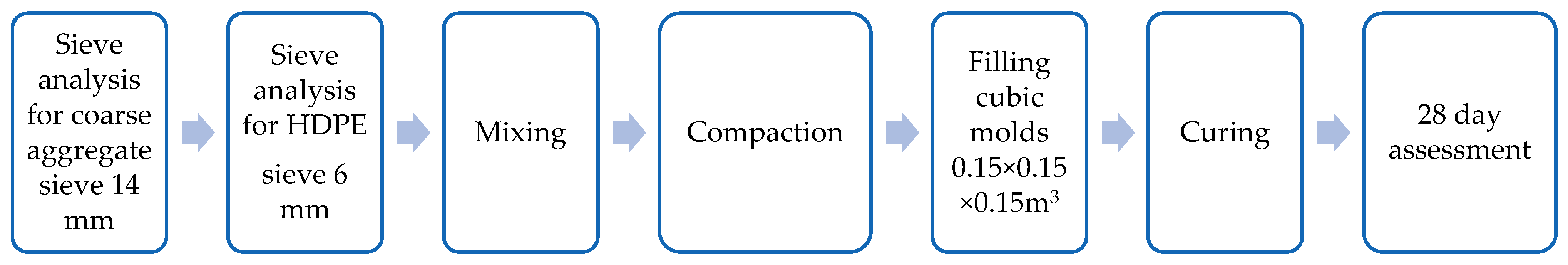 The targeted gap in this study is to utilize recycled HDPE as a substitution to the coarse aggregates in the concrete mix, which reduce the energy consumption rates in both the concrete and solid waste industries. Based on previous studies, various countries are already implementing this approach, such as India, the United States, China, the United Kingdom, and the United Arab Emirates. Although the main focus is on utilizing PET, HDPE’s advantages can achieve the standard mechanical properties of the concrete mix design for non-structural pavement applications [8]. Consequently, using recycled plastic in the concrete pavement is attainable and already applied. The key issue is in meeting the standard mechanical properties for the concrete application [8,12,13].