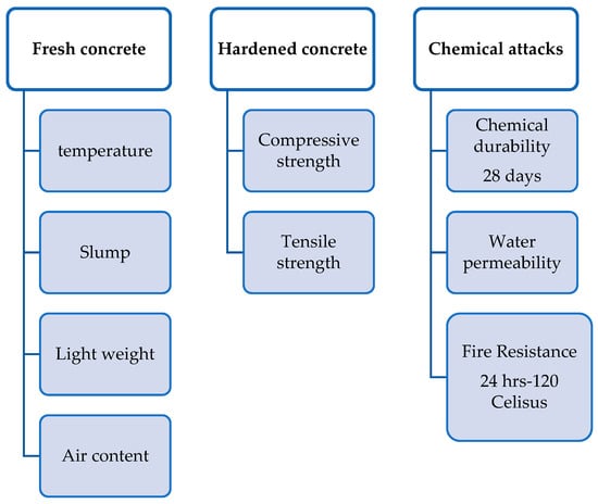 Figure 10. Experimental work for fresh and hardened concrete. - The slump test is to measure the workability of the fresh concrete mix, to avoid air voids and weak concrete properties. This is shown in Table 2.