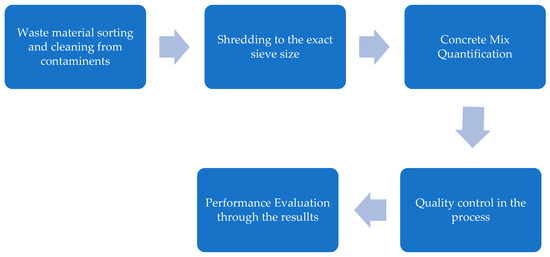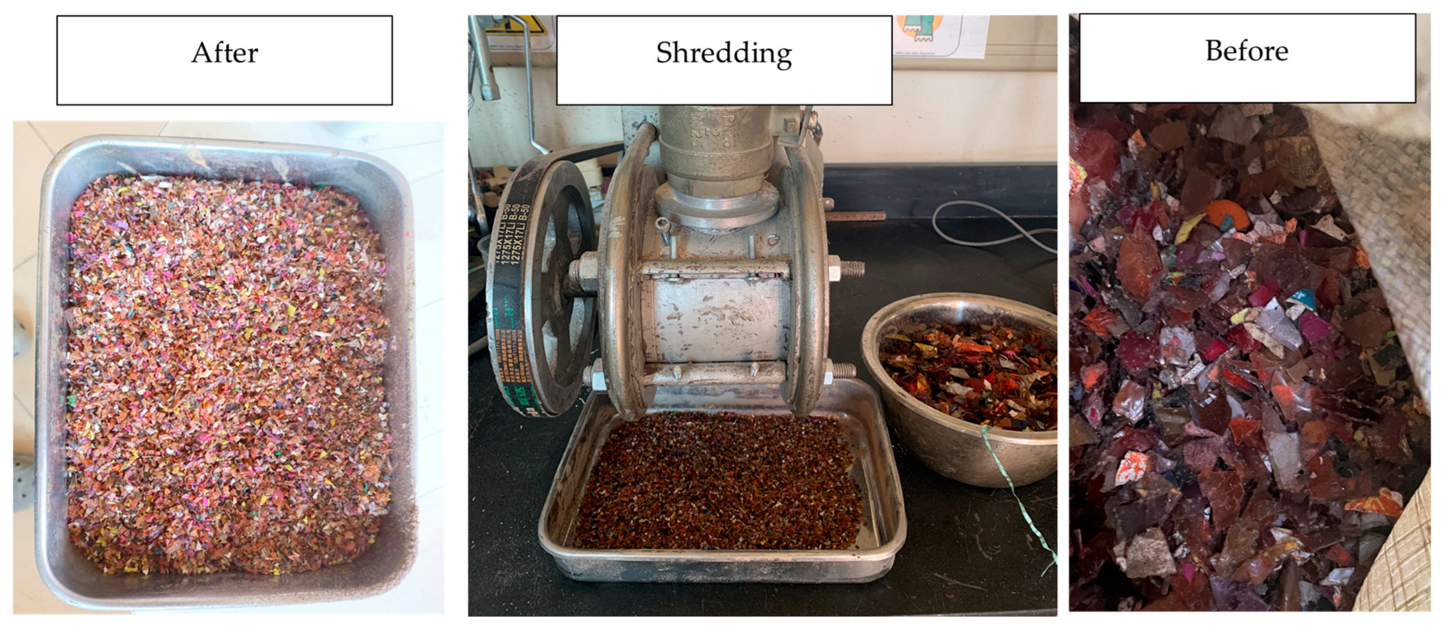 The waste material preparation linear process, as shown in Figure 8, is considered a wide-ranging break down to any type of plastic waste that should be prepared before mixing with the concrete mix design. This will enhance the properties of the plastics in future applications, and it may widen the platform for using these plastics. Also, plastics are considered energy-saving materials if they pass through suitable recycling processes and the suitable shredding size, as shown in Figure 9.