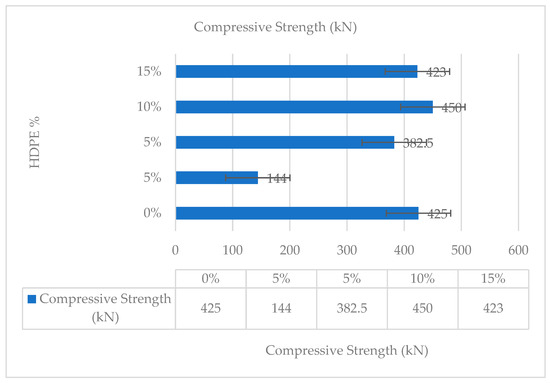 Shown in Table 5 are the results of the fresh concrete tests, such as slump, unit weight, and the air content test. This study examines Mix 1, which encompasses both the conventional mix and Mix–HDPE. Following the verification of the fresh concrete mix’s quality, compressive and tensile strength tests were conducted over a 28-day period. As depicted in Figure 10, the optimal compressive strength was achieved when recycled HDPE constituted 10% of the coarse aggregates, surpassing the performance of the conventional concrete mix, as shown in Figure 11. In terms of tensile strength, as shown in Figure 12, the best result was also observed at the 10% recycled HDPE level, as shown in Table 6, closely matching that of the conventional mix. Conversely, the 5% recycled HDPE mix exhibited failure, as shown in Figure 13. The failure was due to using different sizes of shredded plastic, which created many air voids in the mix. However, utilizing a smaller shredded plastic sieve size of 4.75 improved the results, although a 5% enhancement is still unsatisfactory.