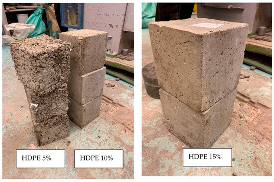 Recycled concrete cubes with 5% to 15% of HDPE.