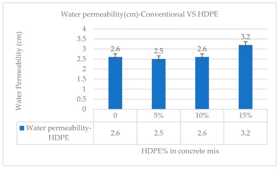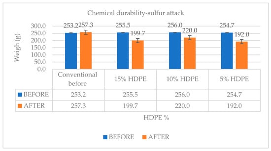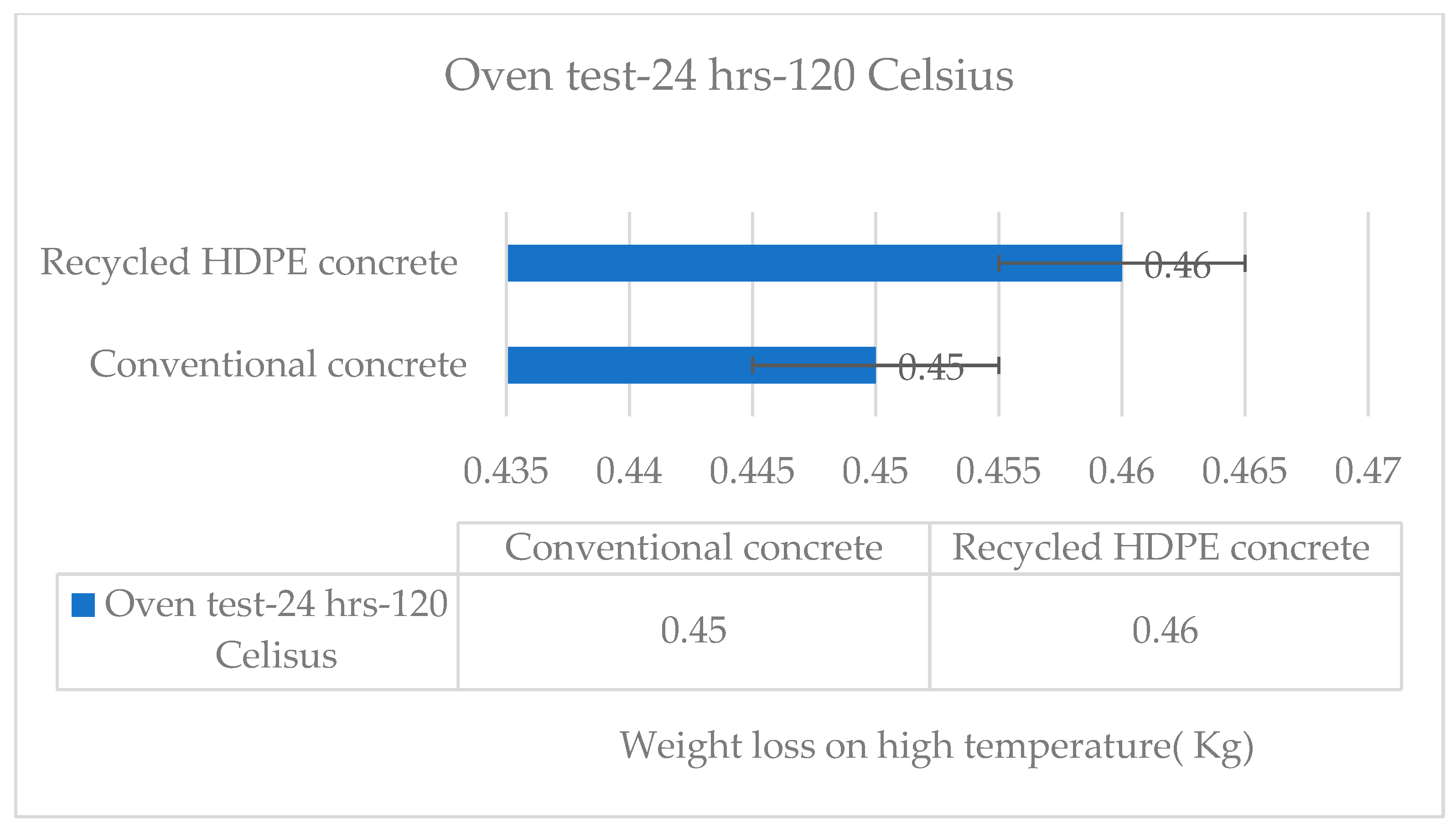We are now progressing to the tests conducted on hardened concrete. Following the selection of the successful samples, we carried out a water permeability test to evaluate the depth of water penetration within the concrete cubes. Figure 14 demonstrates that both the conventional concrete and the HDPE-10% samples yielded satisfactory results. In Figure 15 and Figure 16, the sulfur attack test assesses the performance and durability of the recycled HDPE after the cubes have been combined and allowed to cure for 3 days. While the conventional concrete displayed moderate durability, the recycled concrete experienced a loss in weight. This suggests that stronger compaction and the incorporation of a superplasticizer may be essential to achieve adequate durability for pavement applications. As for the oven test, weight loss of the recycled HDPE is slightly higher than the conventional concrete, as shown in Figure 17. The results are the average values of the number of tested cubes.