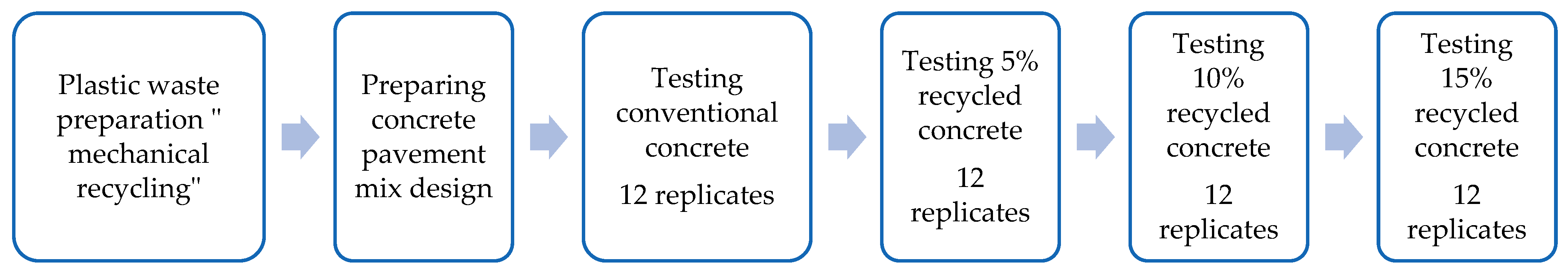 As mentioned in this study, various types of plastic have different characteristics; each has its own characteristics that serve specific applications. Utilizing recycled plastic in the applications of the concrete industry is a recent approach that allows a platform for more trials and additions. Beyond plastic, a wide array of waste materials can serve as viable substitutes for conventional coarse aggregates in concrete mixes. Since this study aims to utilize recycled plastic in pavement applications and widen the horizon of recycled plastic in the construction industry, the method will experiment with different types of recycled plastics to enhance the pavement application properties, as shown in Table 1.