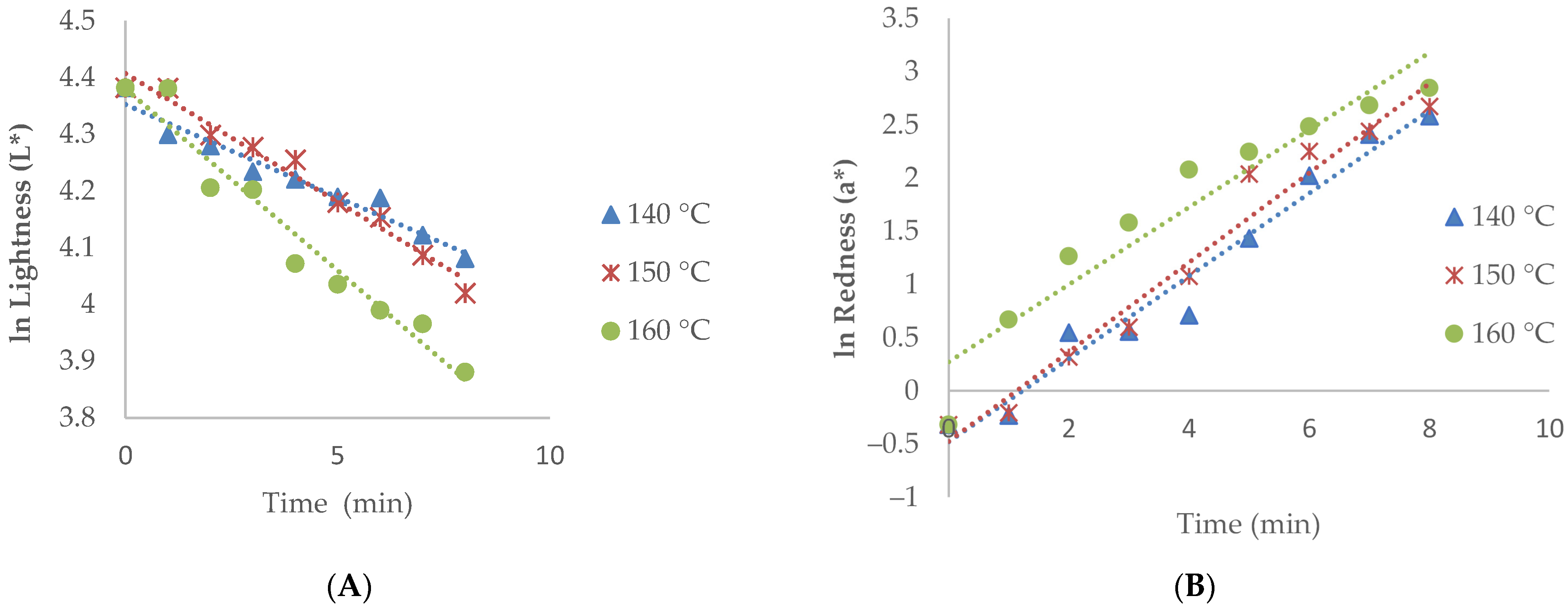 - Nourian, F.; Ramaswamy, H.S. Kinetics of quality change during cooking and frying of potatoes: Part II. Color. J. Food Process Eng. 2003, 26, 395–411. [Google Scholar] [CrossRef]