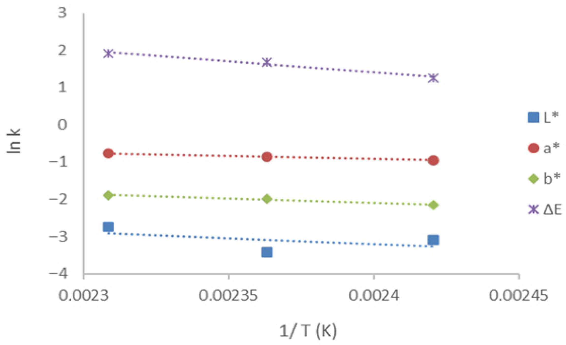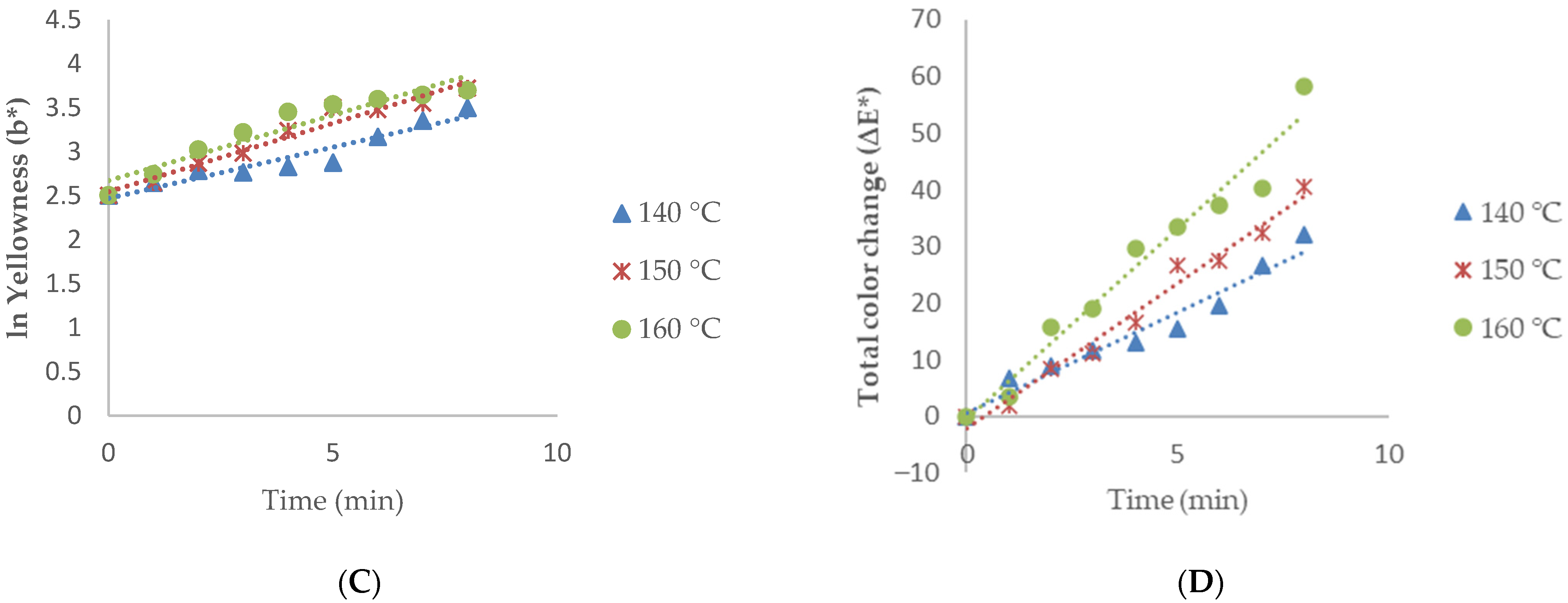| b* | 140 150 160 | First-order kinetic | 0.1163 ± 0.02 a 0.1358 ± 0.42 b 0.1491 ± 0.11 c | 0.919 0.963 0.911 | 0.084 0.073 0.113 | 18.516 ± 0.28 b |