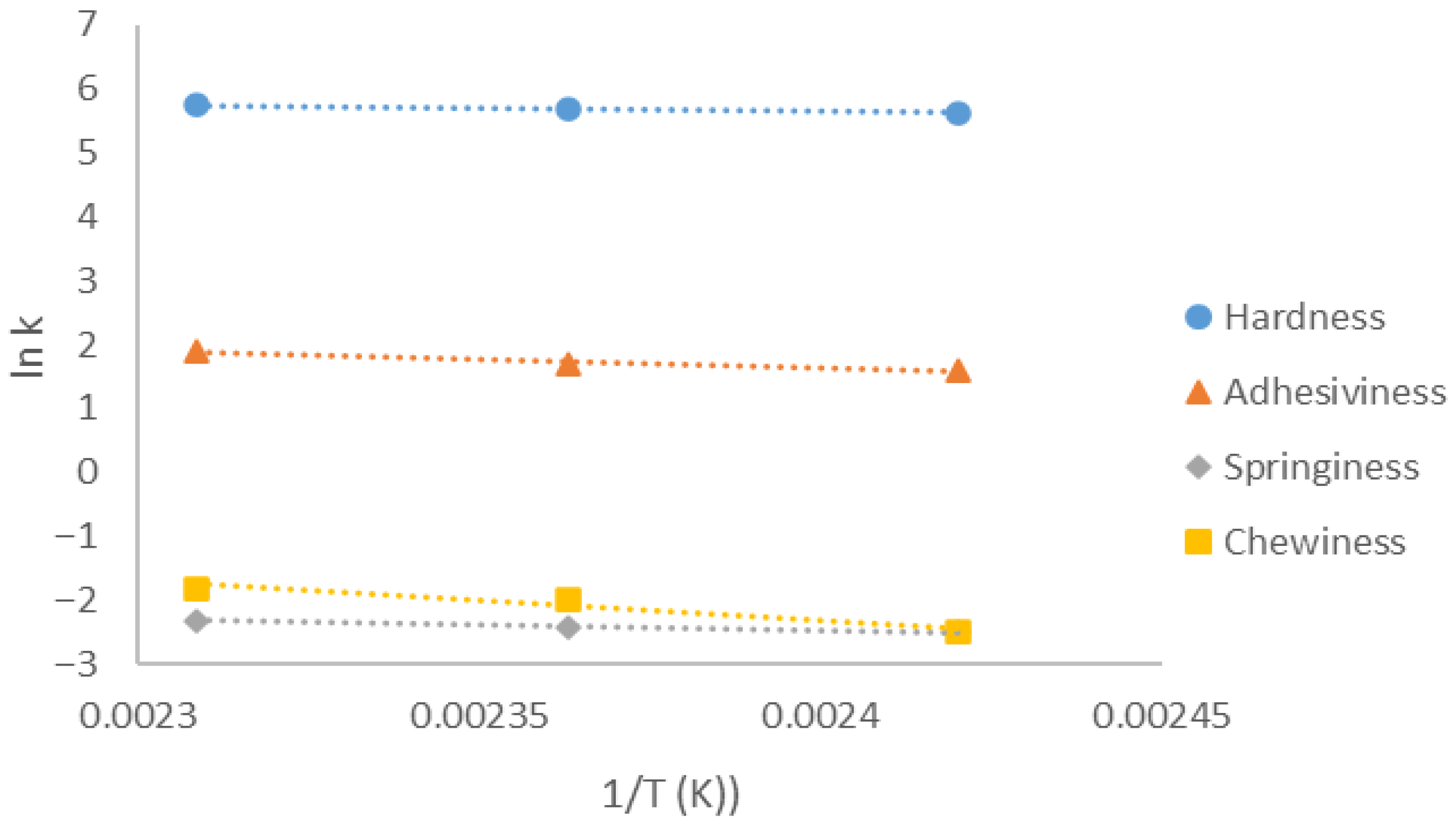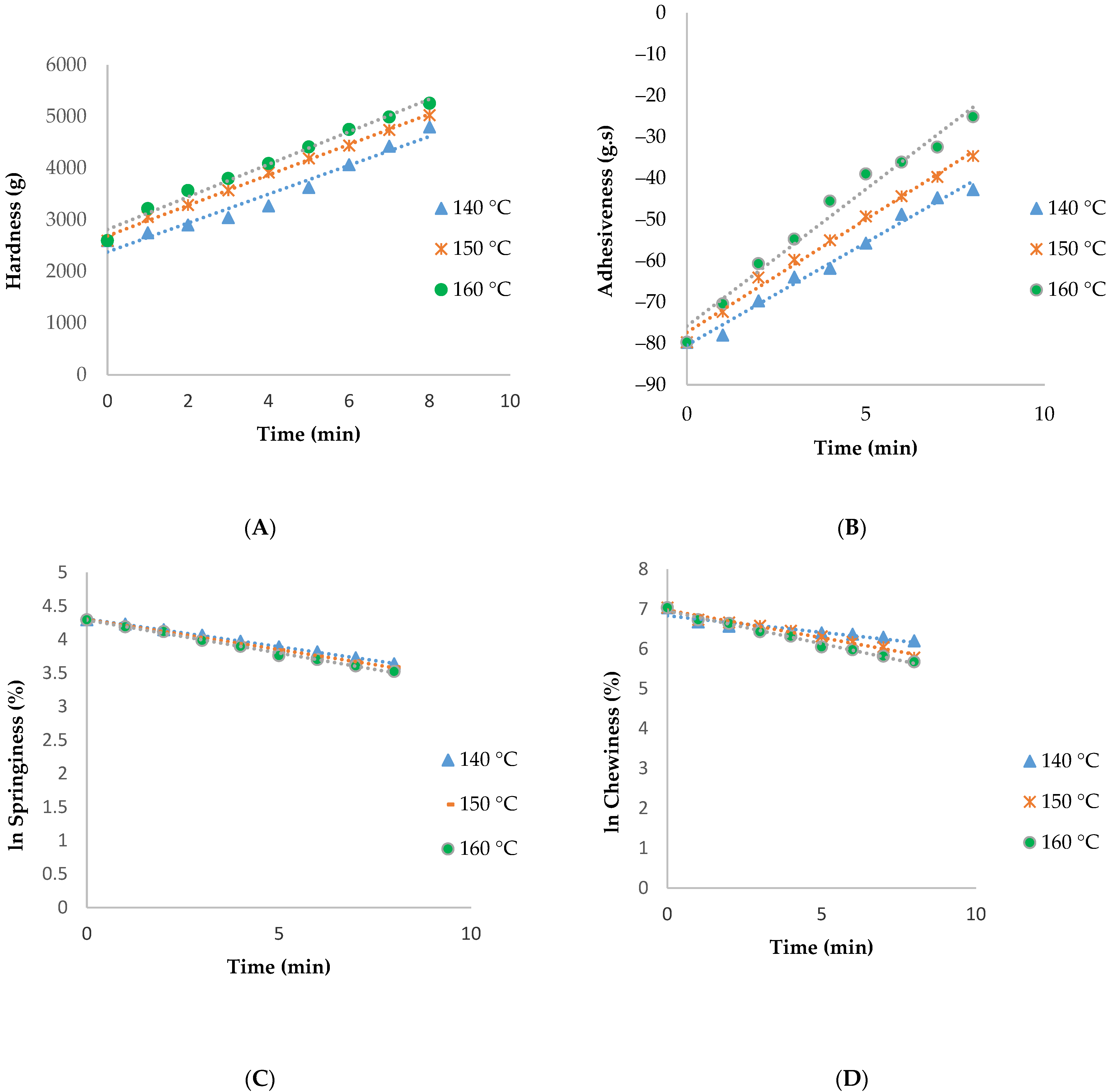 | Chewiness | 140 150 160 | First-order kinetic | −0.083 ± 0.22 c −0.138 ± 0.19 b −0.164 ± 0.018 a | 0.895 0.988 0.976 | 0.083 0.052 0.043 | 50.857 ± 0.41 d |