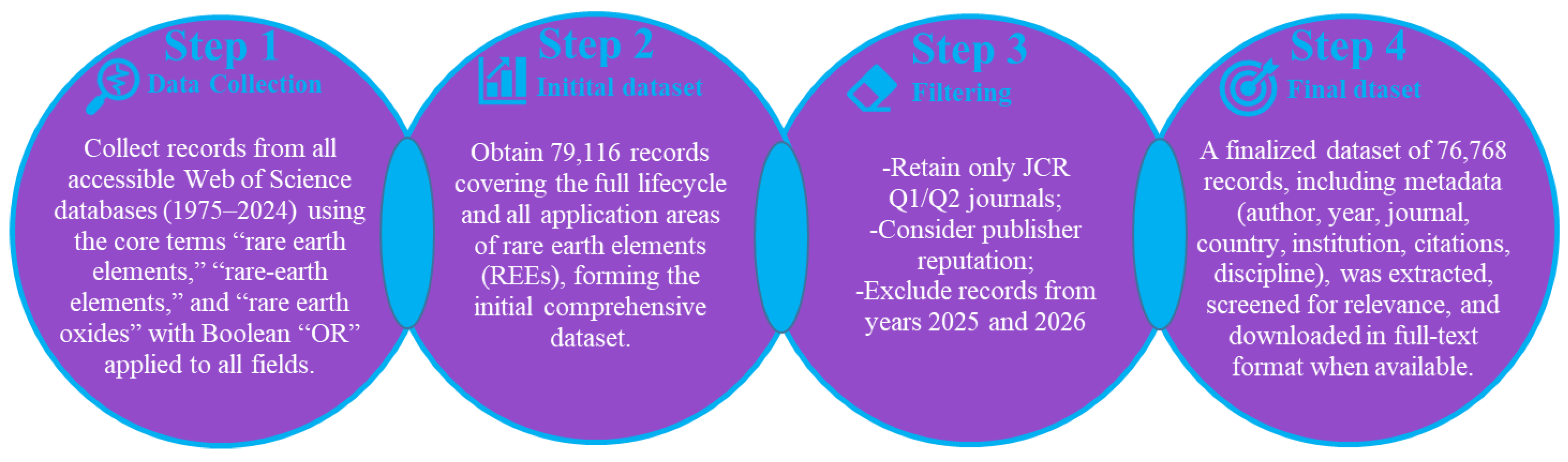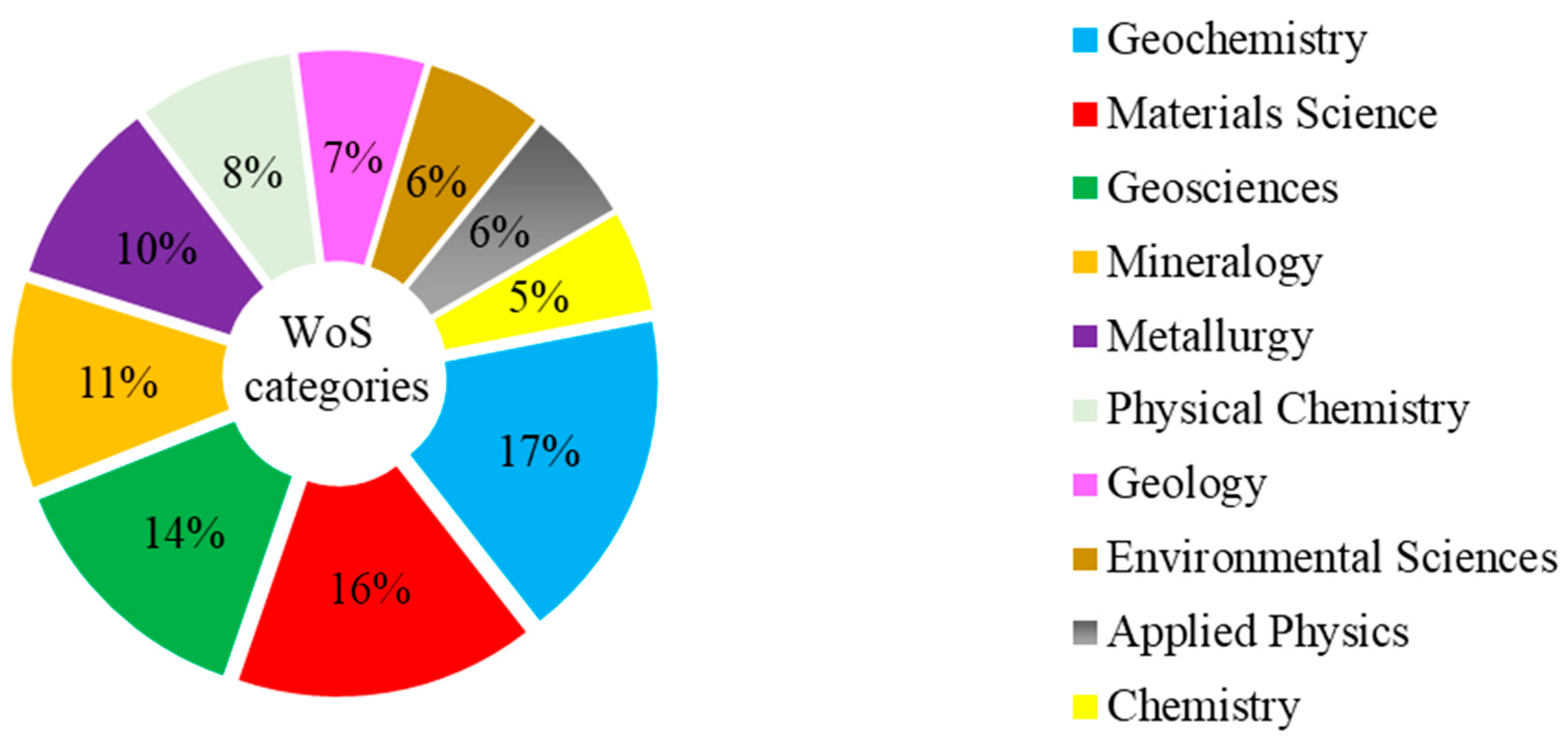 Figure 9). The leading fields—geochemistry (17.4%), materials science (15.8%), and geosciences (13.6%)—demonstrate sustained scientific engagement with REE behavior in natural systems, resource development, and the engineering of advanced materials. Notable representation in mineralogy (10.9%) and metallurgy (9.9%) underscores the importance of mineralogical characterization and metallurgical innovation in REE extraction and processing. Contributions from chemistry (physical: 8.2%; general: 5.3%) reflect ongoing efforts to understand bonding, separation mechanisms, and thermodynamics. The presence of geology (6.7%) and environmental science (6.1%) signals a growing focus on exploration strategies and environmental sustainability. The inclusion of applied physics (5.8%) points to the expanding role of REE in high-tech applications such as magnetics, photonics, and electronics. Collectively, these patterns indicate that REE research is foundational to earth and material sciences, while being increasingly oriented toward technological innovation and sustainable development.