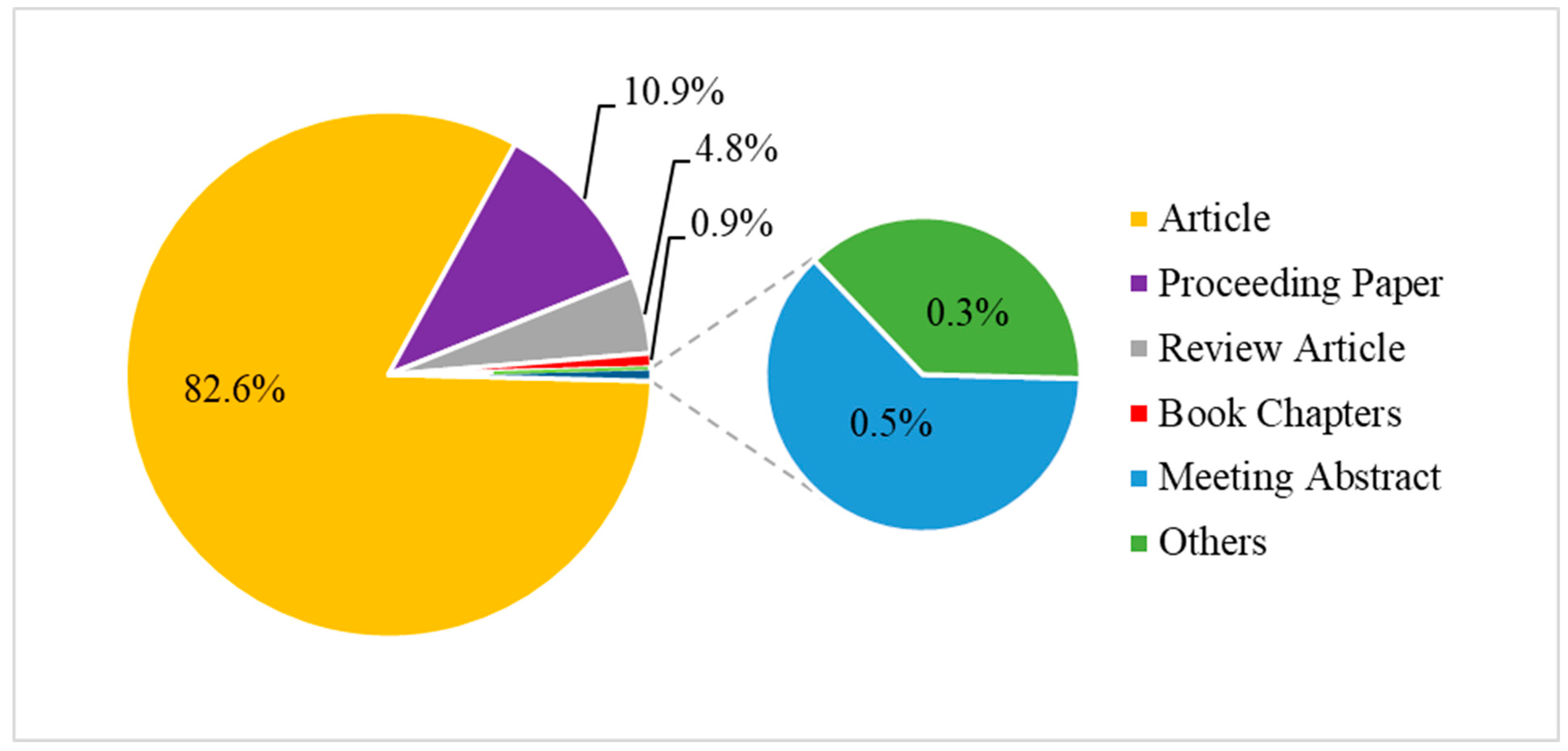 Table 5), English overwhelmingly dominates scientific publishing, accounting for 73,372 publications, far surpassing all other languages. The next most common languages are Chinese (1729), Russian (968), German (206), and Japanese (189), followed by French (103), Spanish (43), Ukrainian (29), Korean (26), and Polish (26). This distribution underscores the global role of English as the primary language of scientific communication and reveals the limited visibility of non-English publications in international citation databases. The dominance of English in WoS highlights the need for greater multilingual inclusivity and improved representation of regional research outputs in global science.