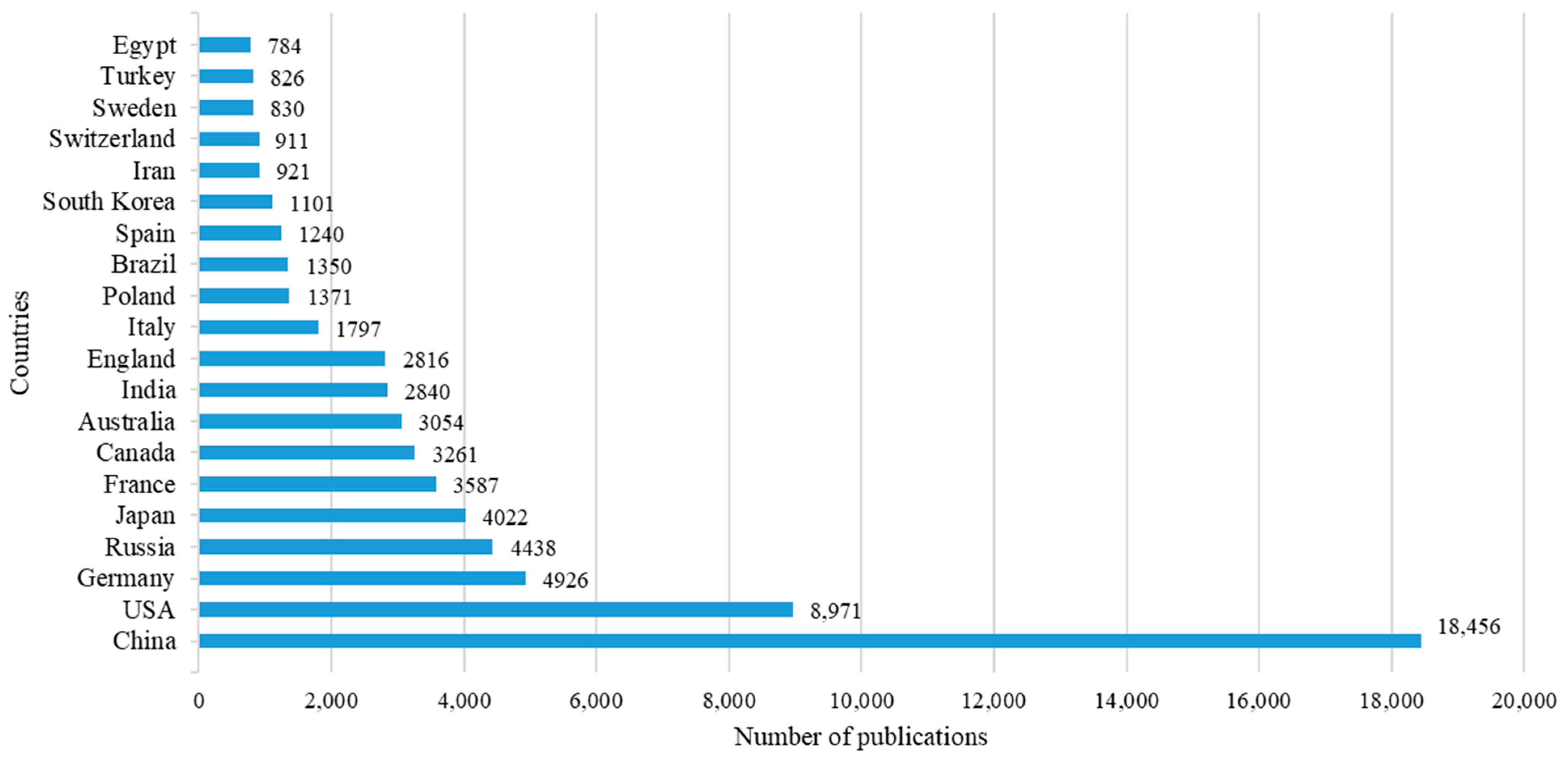 Figure 4). Country and institutional outputs were conducted using full counting, whereby each publication was fully attributed to all contributing countries and institutions. For clarity, the country-level analysis focuses on the top 20 most productive countries in REE research (1975–2024), ranked by publication output using the full-counting method; all other countries were aggregated to improve visualization clarity. Over this period, China emerged as the leading contributor, with 18,456 publications—more than double that of the second-ranked United States (8971). Germany (4926), Russia (4438), Japan (4022), and France (3587) also show strong engagement, reflecting their long-standing involvement in materials science and critical raw materials research. Other significant contributors include Canada (3261), Australia (3054), India (2840), and England (2816), indicating a globally distributed research effort across Asia, North America, and Europe. Countries such as Italy (1797), Poland (1371), Brazil (1350), and Spain (1240) also demonstrate consistent involvement. In East and Southeast Asia, South Korea (1101) has played a notable role, alongside Iran (921) and Turkey (826) from the Middle East. European nations like Switzerland (911), Sweden (830), and Austria (not listed) maintain moderate contributions, while African countries such as Egypt (784) and South Africa (not listed here) also participate. This distribution underscores the global strategic significance of REE and the wide-reaching international collaboration addressing technological, environmental, and economic challenges associated with these critical elements.