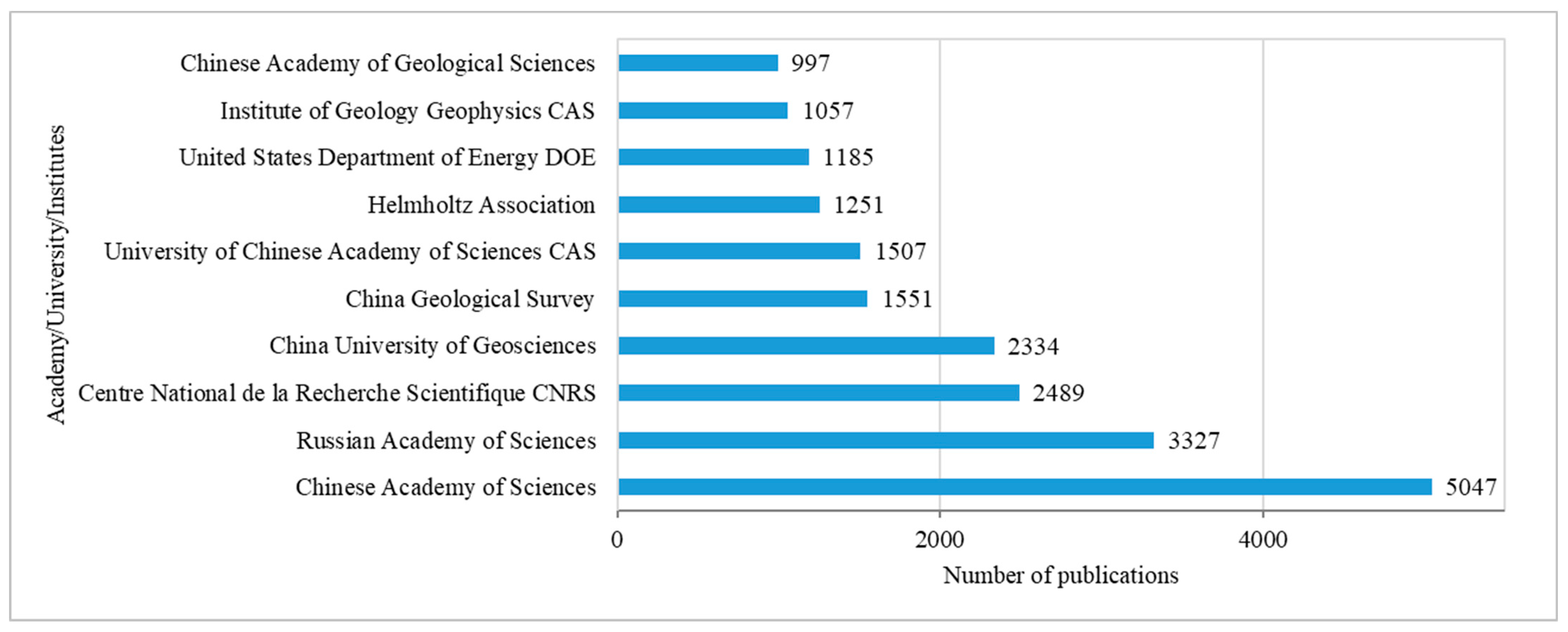 Figure 8 present the total publication count of the top 10 academies/universities/institutions and departments/laboratories involved in REE research. Between 1975 and 2024, the global landscape of REE research has been dominated by a set of leading institutions and departments, as recorded in Web of Science. The Chinese Academy of Sciences leads with 5047 publications, followed by the Russian Academy of Sciences (3327), the Centre National de la Recherche Scientifique (CNRS) (2489), and major Chinese institutions such as the China University of Geosciences (2334), the China Geological Survey (1551), and the University of Chinese Academy of Sciences (1507). Other notable contributors include Germany’s Helmholtz Association (1251), the United States Department of Energy (DOE) (1185), and specialized research arms such as the Institute of Geology and Geophysics, CAS (1057), and the Chinese Academy of Geological Sciences (997). At the departmental and laboratory level, the Faculty of Earth Resources at the China University of Geosciences stands out with 478 publications, followed by the State Key Laboratory of Geological Processes and Mineral Resources (470) and the School of Earth Sciences and Engineering at Nanjing University (468). These are followed by the State Key Laboratory for Mineral Deposits Research (400), departments at Jilin University (386), the Australian National University (381 from the College of Science and 363 from the Research School of Earth Sciences), Northwest University (346), the University of Chinese Academy of Sciences (315), and Germany’s University of Münster (272). This distribution reflects a strong Chinese research emphasis on REE exploration and mineralization, alongside significant contributions from European, North American, and Australian institutions—highlighting the global strategic importance of REE in energy, technology, and critical raw materials.