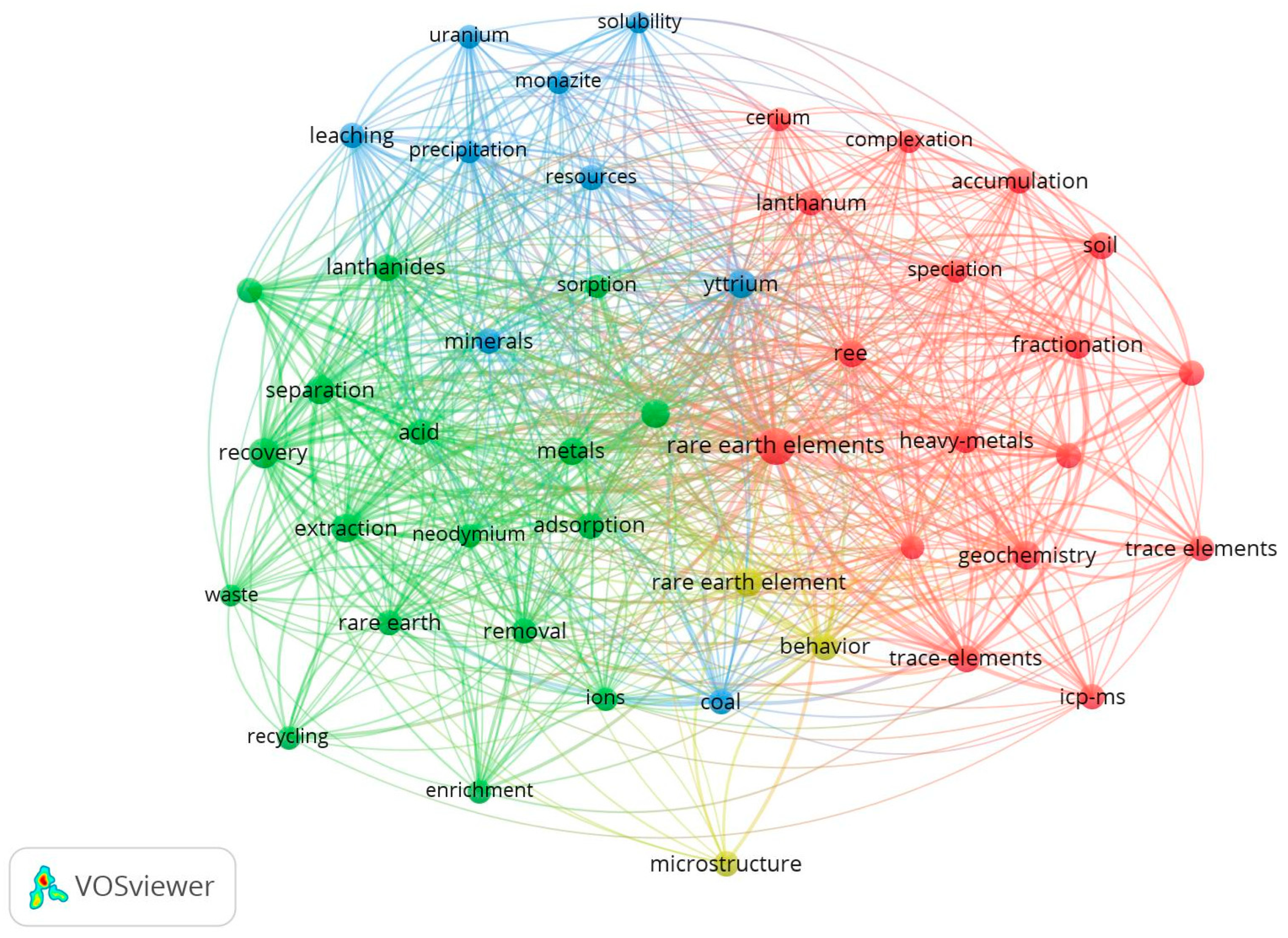 Figure 11) provides strong supporting evidence for the disciplinary integration and thematic diversity of REE research, directly illustrating how geoscience and materials science intersect with environmental and technological studies. The network is organized into four distinct color-coded clusters, each representing a core research focus: Cluster 1—green (extraction and recovery technologies): Focused on keywords like rare earth, lanthanides, acid, extraction, recovery, adsorption, separation, removal, and recycling, this cluster demonstrates the central role of physicochemical processes and industrial techniques for REE recovery from ores, wastes, and secondary resources. Terms like neodymium, enrichment, and waste emphasize the relevance of recycling and circular economy strategies in modern REE research. Cluster 2—red (environmental geochemistry and speciation): Dominated by keywords such as rare earth elements, fractionation, heavy metals, trace elements, speciation, accumulation, geochemistry, complexation, and soil, this cluster reflects the environmental behavior, distribution, and risk assessment of REE in natural systems. It supports the growing importance of mobility, bioavailability, and ecotoxicology in geoscience-led REE research. Cluster 3—blue (mineralogical and geological aspects): Featuring terms such as monazite, uranium, solubility, leaching, precipitation, and resources, this cluster captures the fundamental mineralogical and geochemical basis of REE exploration. Keywords like sorption and minerals highlight studies on primary REE sources, mineral–host interactions, and experimental geochemistry, underpinning resource identification and extraction strategies. Cluster 4—yellow (materials science and coal research): Although smaller, this cluster—centered on keywords like microstructure, coal, and behavior—illustrates the emerging integration of materials science and unconventional REE sources. It reflects rising interest in REE in coal and coal by-products, along with structural and physicochemical analyses using advanced material characterization techniques. Collectively, these clusters provide a conceptual framework confirming that REE research is inherently multidisciplinary, with geoscience and materials science forming its core. They demonstrate how the field encompasses resource recovery, environmental geochemistry, mineralogical fundamentals, and innovative material applications—together driving the strategic development of REE in both scientific and industrial contexts.