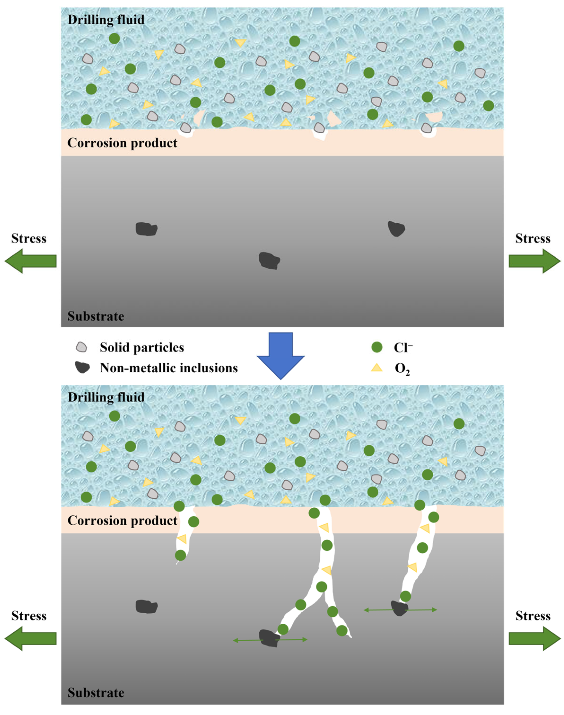 - Fu, A.; Long, Y.; Liu, H.; Zhao, M.; Xie, J.; Su, H.; Li, X.; Yuan, J.; Lei, X.; Yin, C.; et al. Stress Corrosion Cracking Behavior of Super 13Cr Tubing in Phosphate Packer Fluid of High Pressure High Temperature Gas Well. Eng. Fail Anal. 2022, 139, 106478. [Google Scholar] [CrossRef]