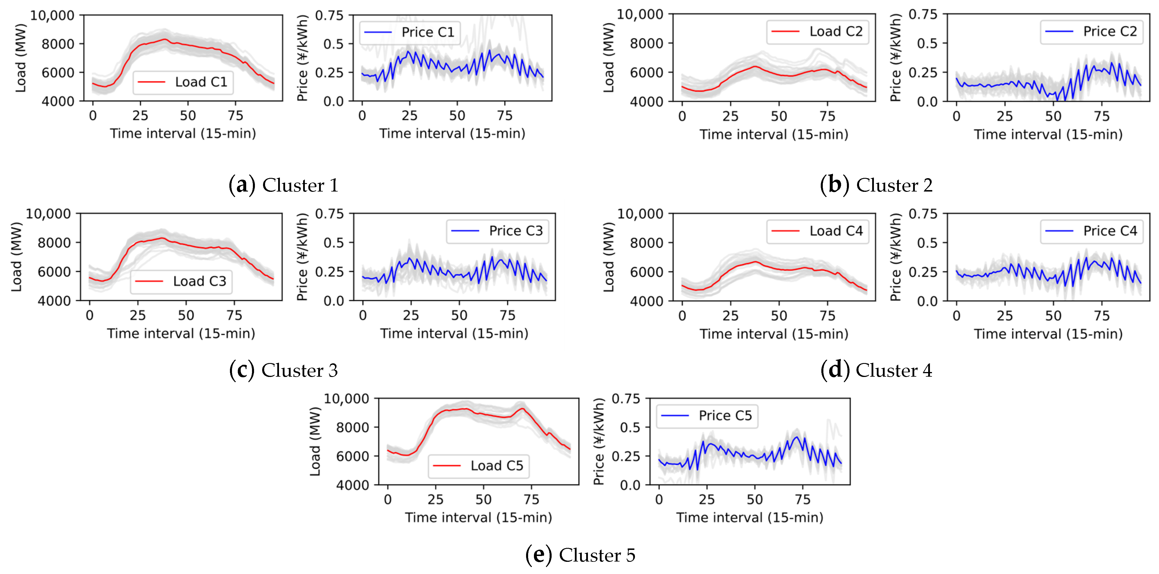 - A market state identification method based on load–price joint clustering is developed to structurally model the temporal interactions between price and load. It allows the automatic extraction of typical market patterns and helps uncover how price fluctuations drive load variations.