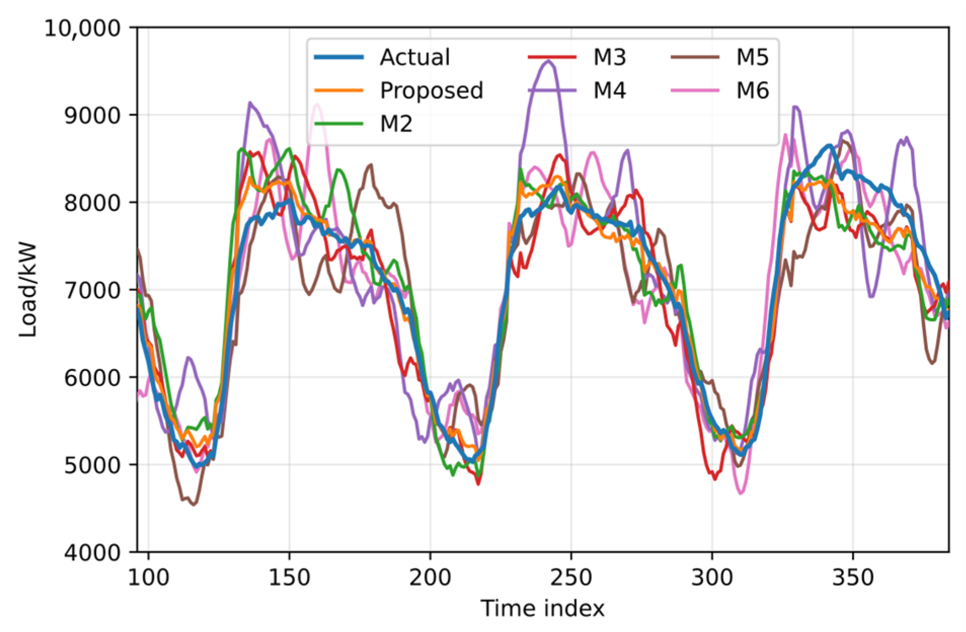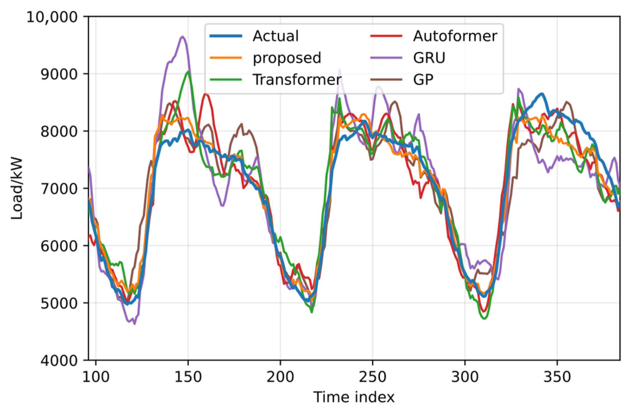 - Deep learning-based load forecasting methods utilize computational models containing multiple processing layers to learn and extract complex, non-linear temporal characteristics and patterns from massive historical load and related data, thereby achieving high-precision artificial intelligence methods for predicting future short-term load [20,21]. Li et al. [22] proposed a novel hybrid model named CEEMDAN-CNN-LSTM-SA-AE to enhance household electricity load forecasting accuracy. The model first decomposes the original load data using CEEMDAN, then extracts local features via CNN, and captures long- and short-term dependencies using an LSTM-AE model integrated with a self-attention mechanism to complete the forecasting. Experiments on two real-world datasets showed that this model significantly outperforms existing baselines with marked improvements across various performance metrics. Tian et al. [23] proposed a method for short-term electric vehicle charging load forecasting that combines Temporal Convolutional Network (TCN) and Long Short-Term Memory (LSTM) networks. This method employs comprehensive similar-day identification technology and analyzes meteorological factors and historical load data for validation. Experimental results indicate that the model effectively improves forecasting accuracy, with a further 2% reduction possible after introducing similar-day analysis. Ahmad [24] proposed a novel Transformer architecture, TFTformer, to enhance power load forecasting accuracy. The model effectively integrates multi-source data such as weather and time through multi-modal feature embedding, linear transformation layers, and temporal convolutional networks, while also enhancing its ability to capture long-range dependencies. In recent years, to overcome the limitations of single models, hybrid models combining machine learning and deep learning have emerged as a new trend in research and application. Tan et al. [25] proposed a forecasting method that combines the SVMD algorithm with an improved Informer model. This method decomposes load data using SVMD and incorporates relative position encoding, causal convolutions, and skip connections into the Informer model to enhance sequence dependency capture and local feature extraction. This model significantly outperforms several mainstream models and provides a reliable technical reference for optimizing intelligent heating systems. Incremona et al. [26] proposed a Gaussian-process-based load forecasting method with a tailored kernel to address the challenge of predicting electricity demand during the moving holiday of Easter Week. Their results on Italian data show that the proposed approach significantly outperforms GP models with canonical kernels as well as the official forecasts of the TSO Terna.