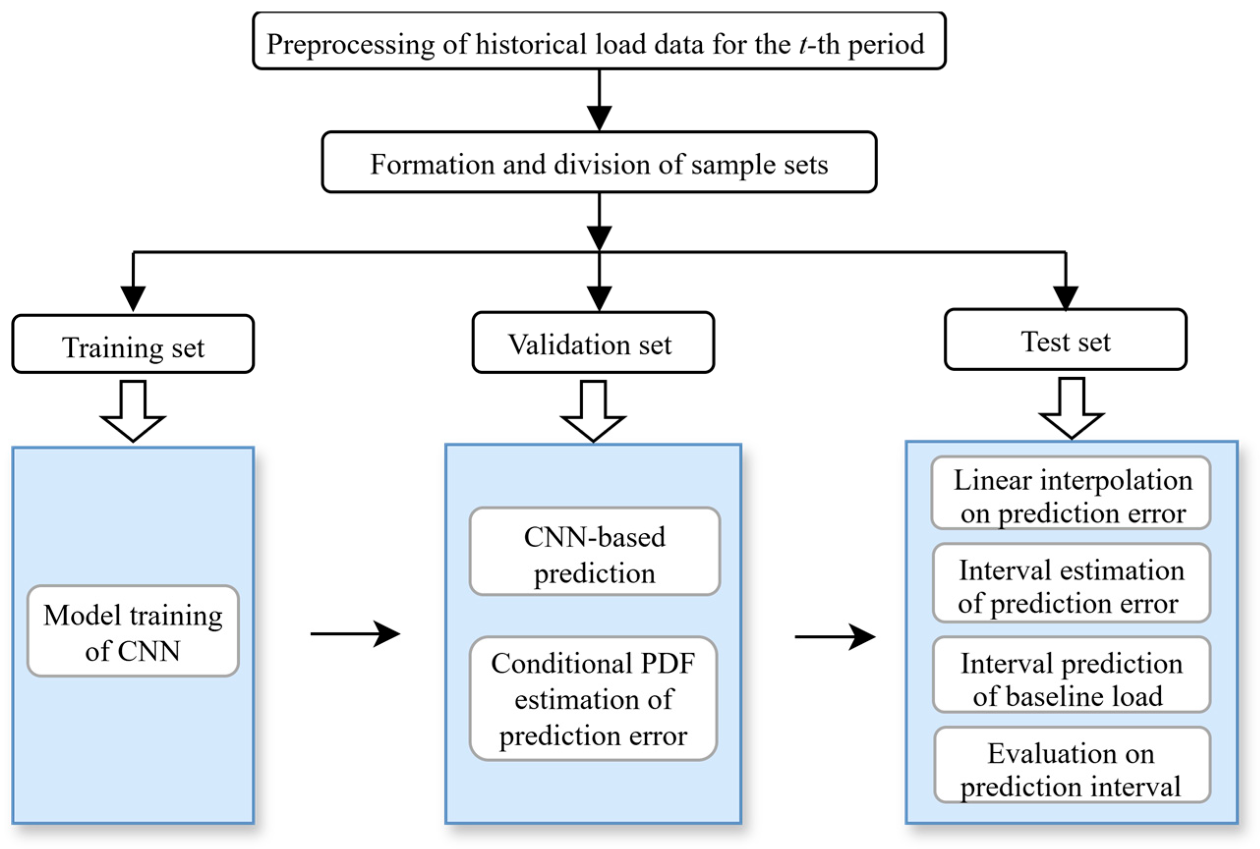 First, historical data for the t-th period of the target day is preprocessed, including supplementing missing data and correcting anomalies. Then, a rolling window method is used to form a sample set, which is proportionally divided into training, validation, and test sets. All data are normalized based on the statistics of the training set. Subsequently, the CNN model is trained using the training set data. Next, nonparametric kernel density estimation (KDE) of prediction errors on the validation set is performed, and the conditional PDF of prediction errors is estimated based on Bayesian theory. Finally, linear interpolation is used to obtain the conditional PDF of prediction errors on the test set, thereby deriving confidence intervals of prediction errors and prediction intervals for the baseline load on the test set, followed by an assessment of the performance of prediction intervals.