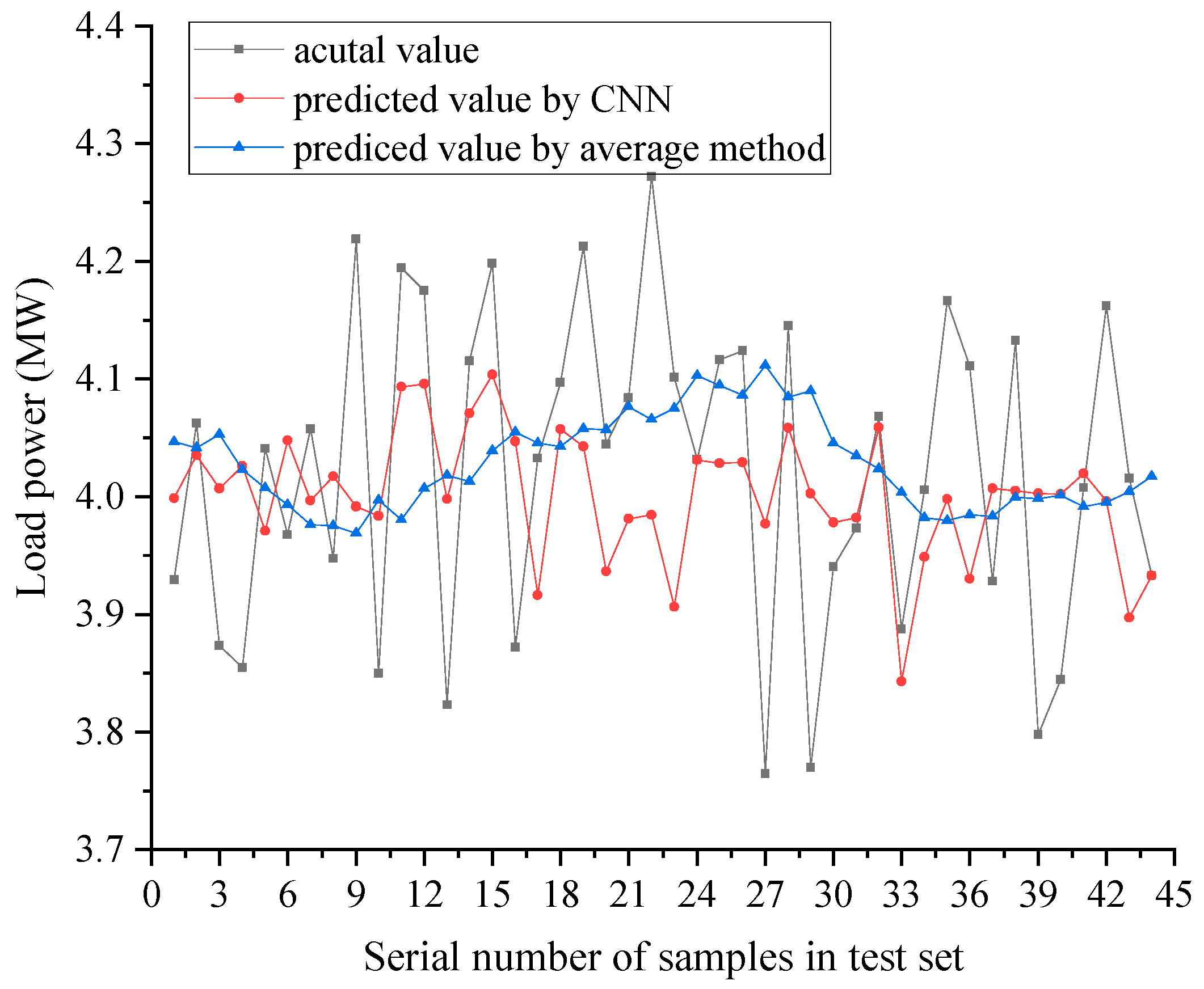 The CNN method can capture a complex nonlinear relationship between the loads at the same period on similar days before the calculation day and the load at the same period on the calculation day, so its prediction results are better than the average method. MAPE decreased from 0.0297 to 0.0273 and RMSE decreased from 0.1364 MW to 0.1297 MW in this case.