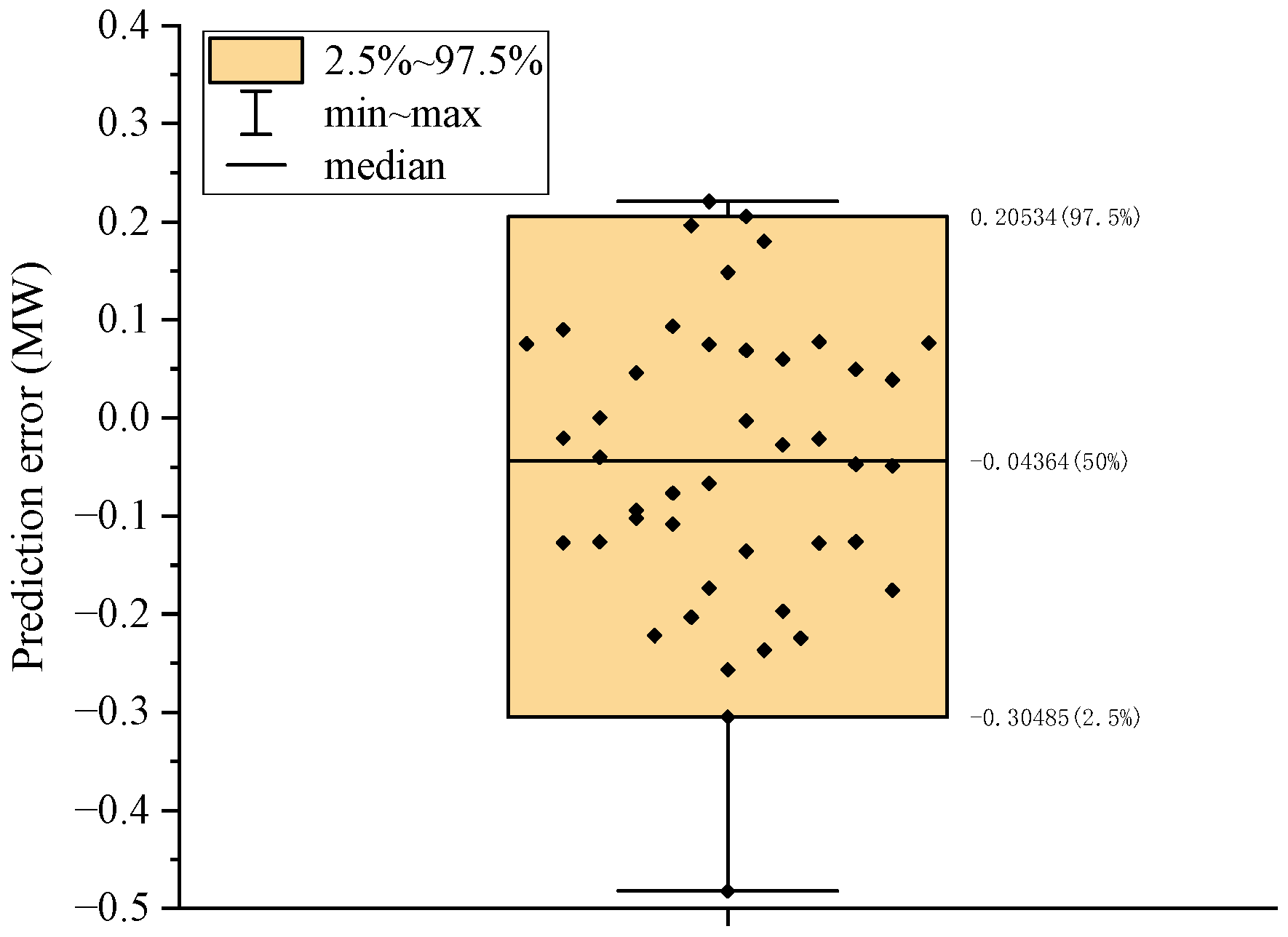 Figure 8. The maximum and minimum prediction errors are 0.22077 MW and −0.48201 MW, respectively, while the mean and median prediction errors are −0.04709 MW and −0.04364 MW, respectively.