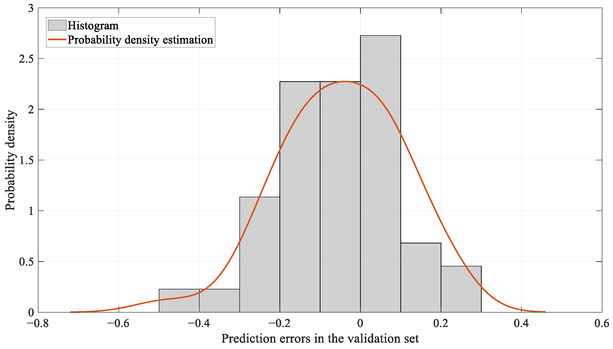 Based on the prediction errors from the empirical set, a nonparametric PDF estimation using a Gaussian kernel density function with a bandwidth of 0.0795 was performed to obtain the marginal PDF of the prediction errors, as shown in