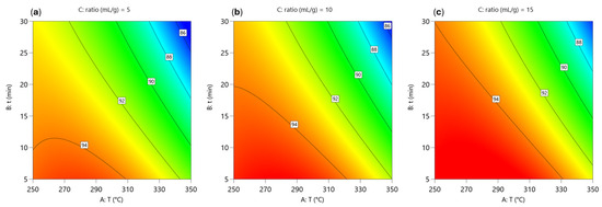 Two-dimensional contour plots of the predicted yield of the DEE-soluble phase (γ(DEE)) during hydrothermal degradation of BPA. Each contour plot was generated by varying reaction temperature (parameter A) and reaction time (parameter B), while the water-to-material ratio (parameter C) was fixed at: (a) ratio = 5 mL/g, (b) ratio = 10 mL/g and (c) ratio = 15 mL/g.