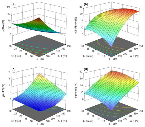 Three-dimensional response surfaces representing the influence of temperature and time (water-to-material ratio = 10 mL/g) on degradation products: (a) γ(BPA), (b) γ(4-IPENP), (c) γ(4-IPP) and (d) γ(phenol).