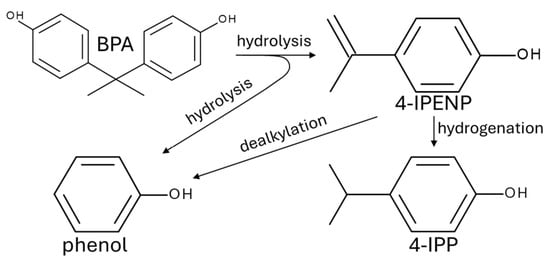 One particularly interesting degradation product is 4-IPENP, which is used as a reactant in the preparation of indanols and also serves as an intermediate in the production of stabilizers, dyes, plastics, pesticides, and photochemical materials [33,34]. 4-IPENP is most conveniently synthesized through the cleavage of BPA. This reaction proceeds at low pressure (≈0.02 atm) and elevated temperatures (>150 °C) in the presence of an alkaline catalyst. However, achieving high 4-IPENP yields is challenging, as the product readily undergoes oligomerization [37].