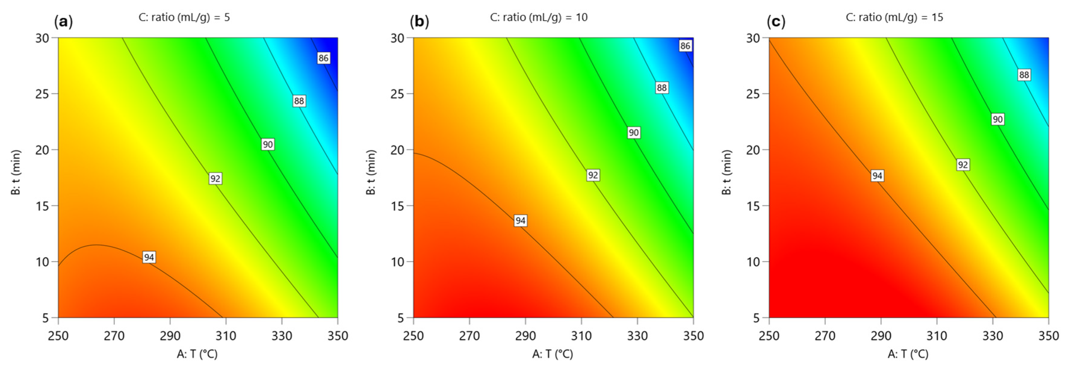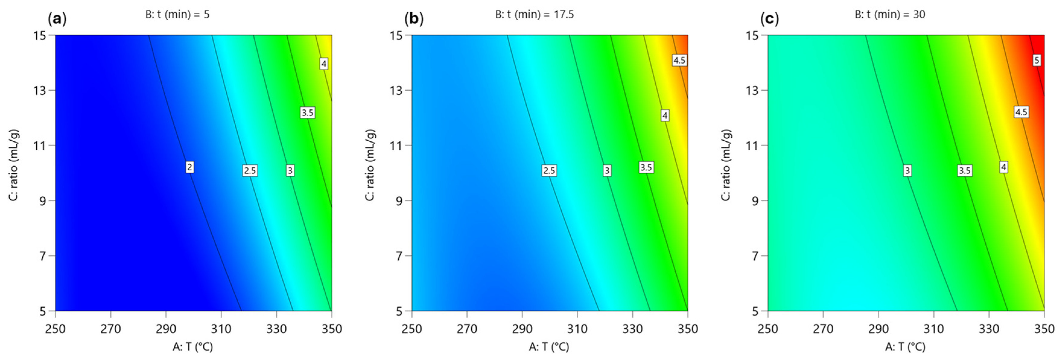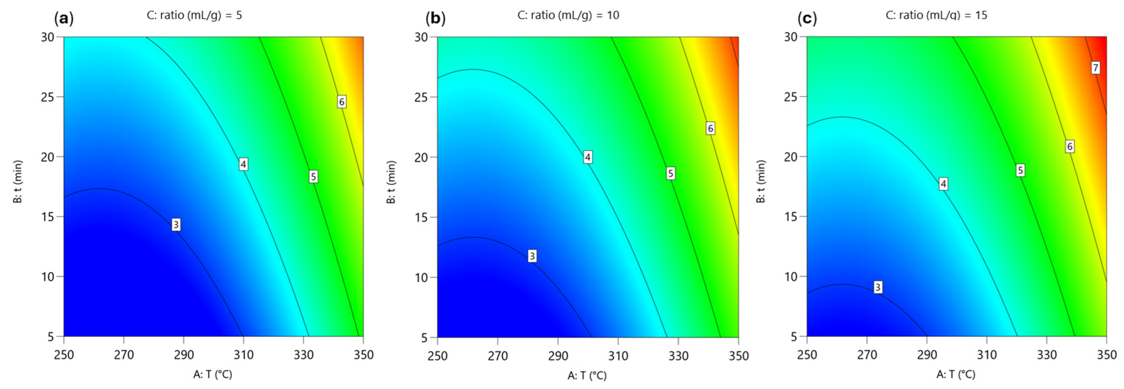 | Experiment # | T (°C) | t (min) | Water-to-Material Ratio (mL/g) |