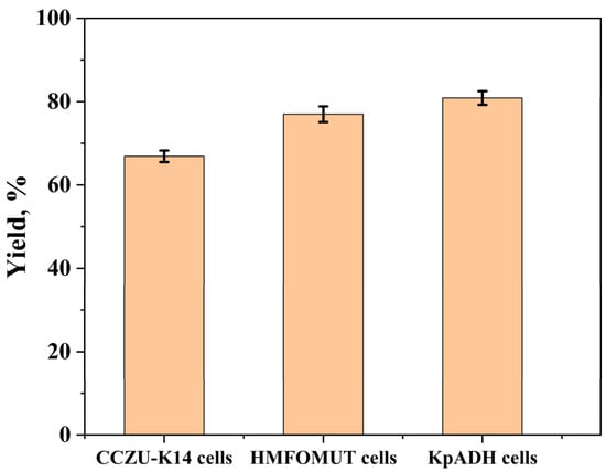 The KpADH recombinant strain was inoculated onto LB agar medium containing 50 μg/mL kanamycin, and cultured at 37 °C overnight. Single colonies on LB agar were taken and incubated overnight in LB liquid medium containing 50 μg/mL kanamycin at 37 °C. The obtained culture was transferred to a new LB liquid medium containing 50 μg/mL kanamycin, incubated at 37 °C until OD600 reached 0.6–0.8, and then the cells were transferred to a TB liquid medium containing 50 μg/mL kanamycin and culturing continued at 37 °C until OD600 reached 0.6–0.8. The inducer 0.5 mM IPTG was added and incubated at 25 °C for 12–16 h to induce protein expression. After centrifugation at 8000 rpm (6720× g) for 3 min, the recombinant E. coli KpADH was resuspended for use. The culture methods of recombinant E. coli CCZU-K14 and recombinant E. coli HMFOMUT were the same as described above.