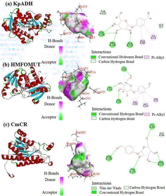 The molecular docking results of three enzymes, KpADH (a), HMFOMUT (b), and CmCR (c), with p-hydroxybenzaldehyde β-glucoside.