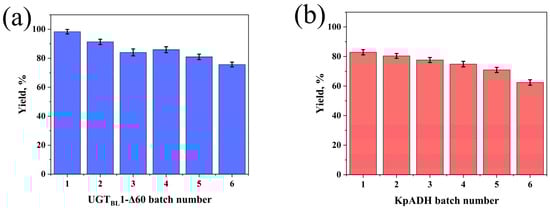 UGTBL1-Δ60 batch reuse (35 °C, pH 7.5, 200 mM glucose, 0.025 g/mL UGTBL1-Δ60 cell loading) (a); E. coli KpADH batch reuse (30 °C, pH 7.5, 0.05 g/mL of KpADH loading, supplementation of 50 mM glucose, 12 h reaction) (b).