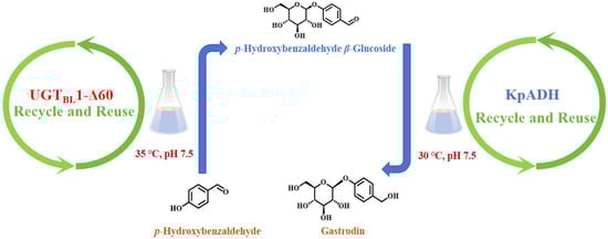 The reusability and stability of UGTBL1-Δ60 and KpADH were tested. After a batch of conversions were completed, the engineered bacteria could be separated by sedimentation through centrifugation, thereby enabling the recovery and reuse of intracellular glycosyltransferases UGTBL1-Δ60 and KpADH. After being reused for six batches under the best conditions, the effect is shown in Figure 5a,b. After the sixth batch, KpADH still maintained a yield of over 60%, and glycosyltransferase UGTBL1-Δ60 still maintained a yield of over 70%. Alcohol dehydrogenase KpADH and glycosyltransferase UGTBL1-Δ60 are intracellular enzymes, and engineered bacteria are natural immobilized carriers of these enzymes. López-Gallego’s group immobilized the engineered acyltransferase LovD9 from Aspergillus terreus (LovD-BuCh2) on controlled porous glass particles functionalized with Fe3+-catechol complexes (EziG1), which maintained over 60% product yield after five operational cycles [44]. The repeated batch transformation experiment of engineered bacteria indicates that the whole cells of engineered bacteria containing glycosyltransferase UGTBL1-Δ60 and the whole cells of engineered bacteria containing alcohol dehydrogenase KpADH had good stability and could be reused in small batches. Tang developed KmAKR&BmGDH@amino resin-PEI for the asymmetric reduction of tert-butyl 6-cyano-(5R)-hydroxy-3-oxohexanoate; the reactive activity of the immobilized enzymes remained at 80.7% after 10 cycles of reuse [45]. This was also one of the methods to reduce production costs during industrial-scale production. In industrial production, cells could also be immobilized to further facilitate the reuse of whole cells. In addition, due to the good reusability of glycosyltransferases UGTBL1-Δ60 and KpADH, it can be attempted to enhance the stability and reduce the costs of immobilized cells, providing a new idea for the process production of gastrodin.