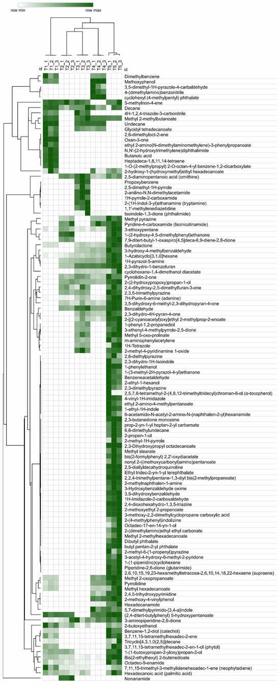 Heatmap of the scaled data of GC-MS analysis, with the samples (both columns and rows) arranged according to the HCA (Spearman method of cluster agglomeration). The intensity of green color indicates the abundance of the compounds in samples, as indicated in the color scale.