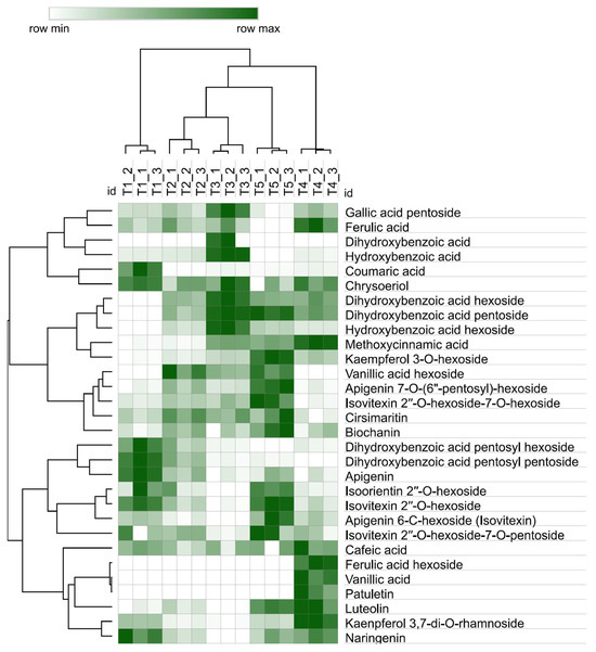 The LC-MS-Orbitrap analysis identified 30 metabolites in 5 samples, which included hydroxybenzoic acids, hydroxycinnamic acids, flavonoid glycosides, and flavonoid aglycones. Obtained chromatograms from LC-MS analysis are presented in Figure S2. Thus, T3 had the higher amount of hydroxybenzoic acids, and T1 was rich in coumaric acid. The maximum flavonoid glycosides were in T5, contributing to its unique chemical profile, while T4 had higher levels of some flavonoids such as its kaempferol derivatives. The flavonoid aglycones remained stable, except for marked variations in T1, T3, T4, and T5.