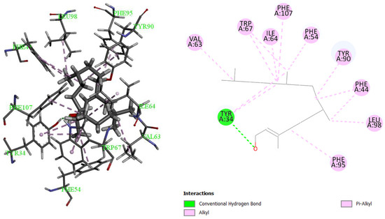 In the case of the first tested protein, a cellular receptor in complex with FK506 from Candida glabrata with the six compounds and 8-deethyl-8-[but-3-enyl]-ascomycin as the control, the best result was for 3,7,11,15-tetramethylhexadec-2-en-1-ol, with a binding affinity energy of −6.5 kcal/mol (Table 3). This compound formed ten alkyl and pi-alkyl bounds and one hydrogen bond in the site where the known inhibitor 8-deethyl-8-[but-3-enyl]-ascomycin binds (Figure 3). Compared to the control molecule, this molecule did not bind better than the inhibitor (control), which has a binding affinity of −10.5 kcal/mol.