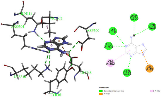 Furthermore, compound 7H-Purin-6-amine, also known as adenine, had better results in binding affinity compared to the enzyme’s known inhibitor (Table 4). Adenine bound to the enzyme active site via five hydrogen bonds (Tyr16, Asp300, Lys 310, Arg304, and Gln111) and two pi-anion and pi-alkyl bounds, with Val302 and 48Glu presenting a binding affinity of −5.9 kcal/mol (Figure 4). In this case, one compound among all tested compounds gave better results compared to the control compound.