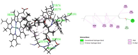 The last enzyme, CYP51, was tested with the six compounds and with the inhibitor. One compound, 3,7,11,15-tetramethylhexadec-2-en-1-ol, had better binding affinity compared to other tested compounds, with a binding energy of −8.0 kcal/mol (Table 5). This compound bound to the active site of the enzyme via two hydrogen bonds (Ser336 and His335) and six alkyl and pi-alkyl bonds (Phe191, Phe338, Leu79, Tyr76, Leu334, and HEM) (Figure 5).
