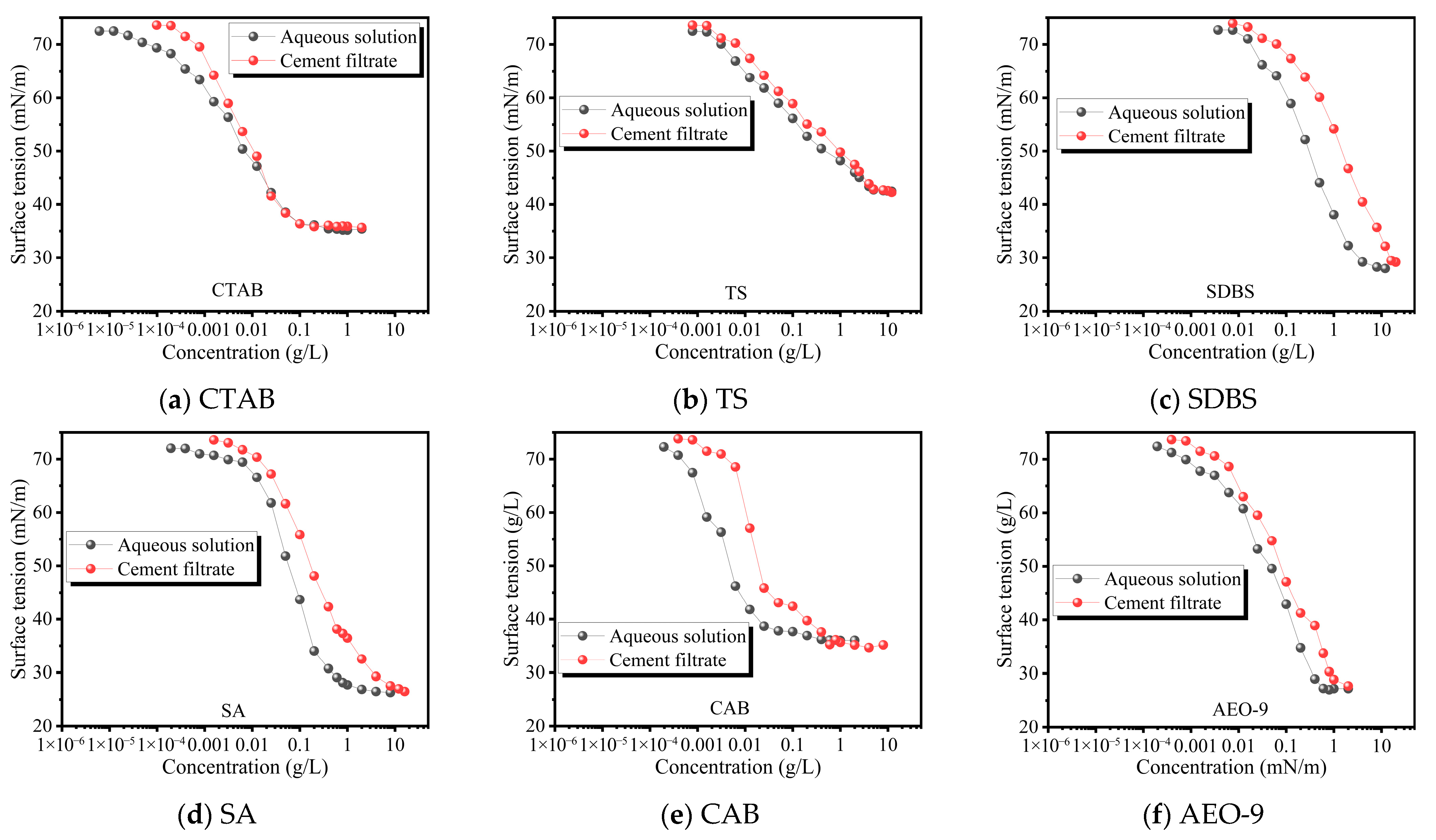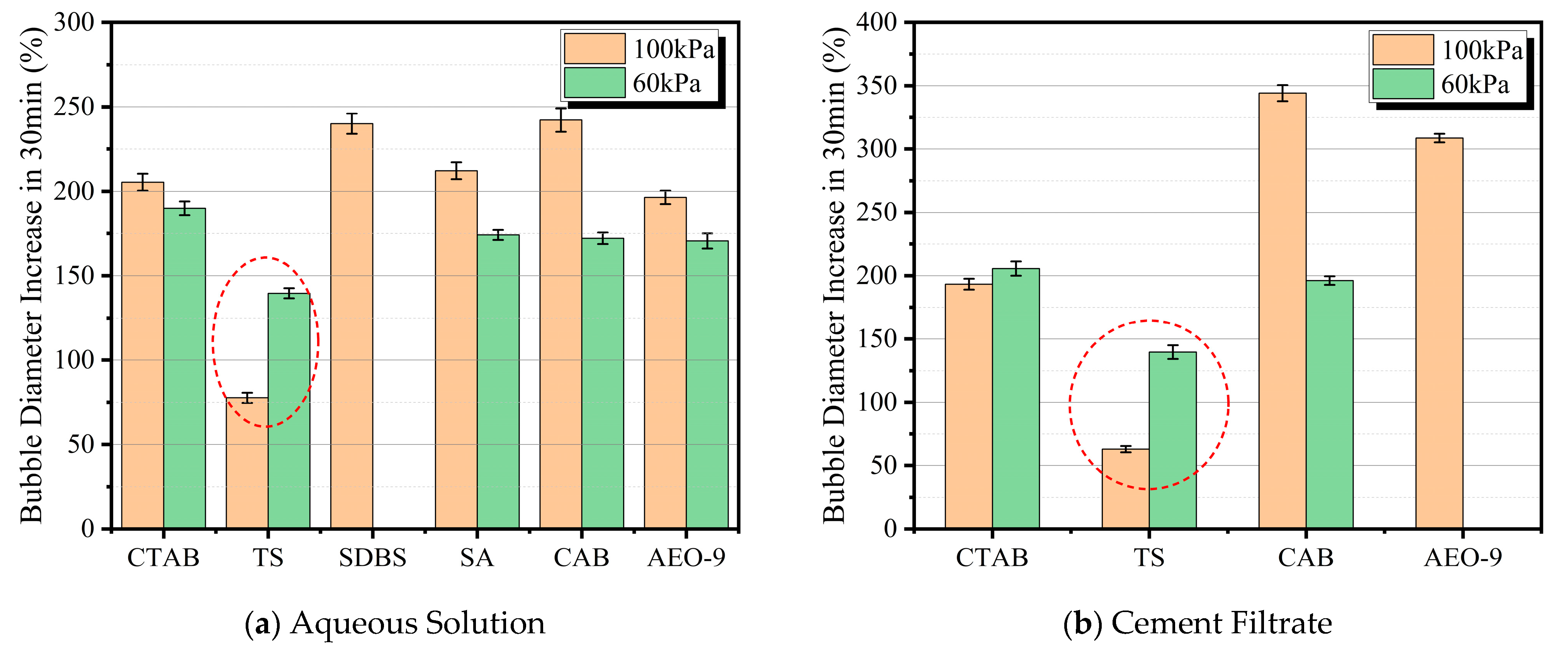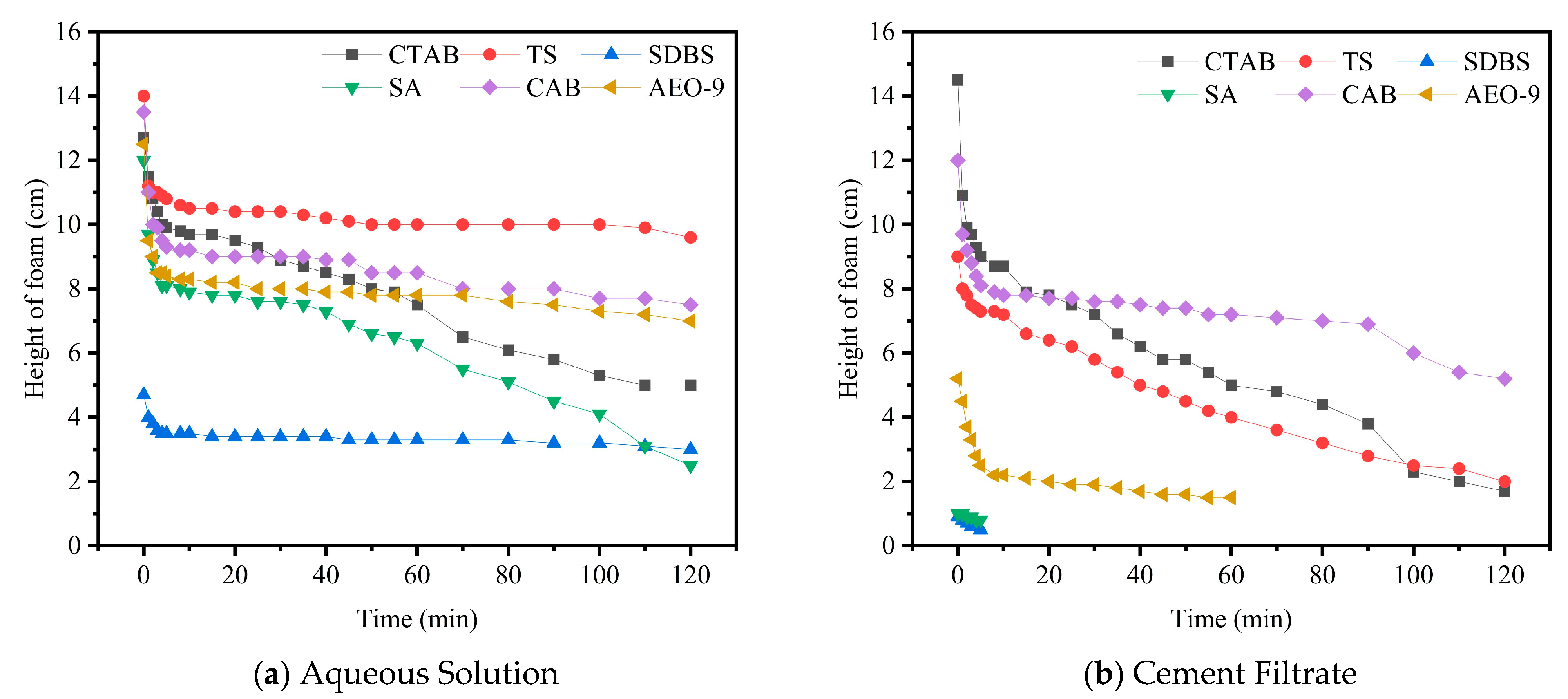3.1.2. Time-Dependent Variation in Foam Height in Aqueous Solution and Cement Filtrate