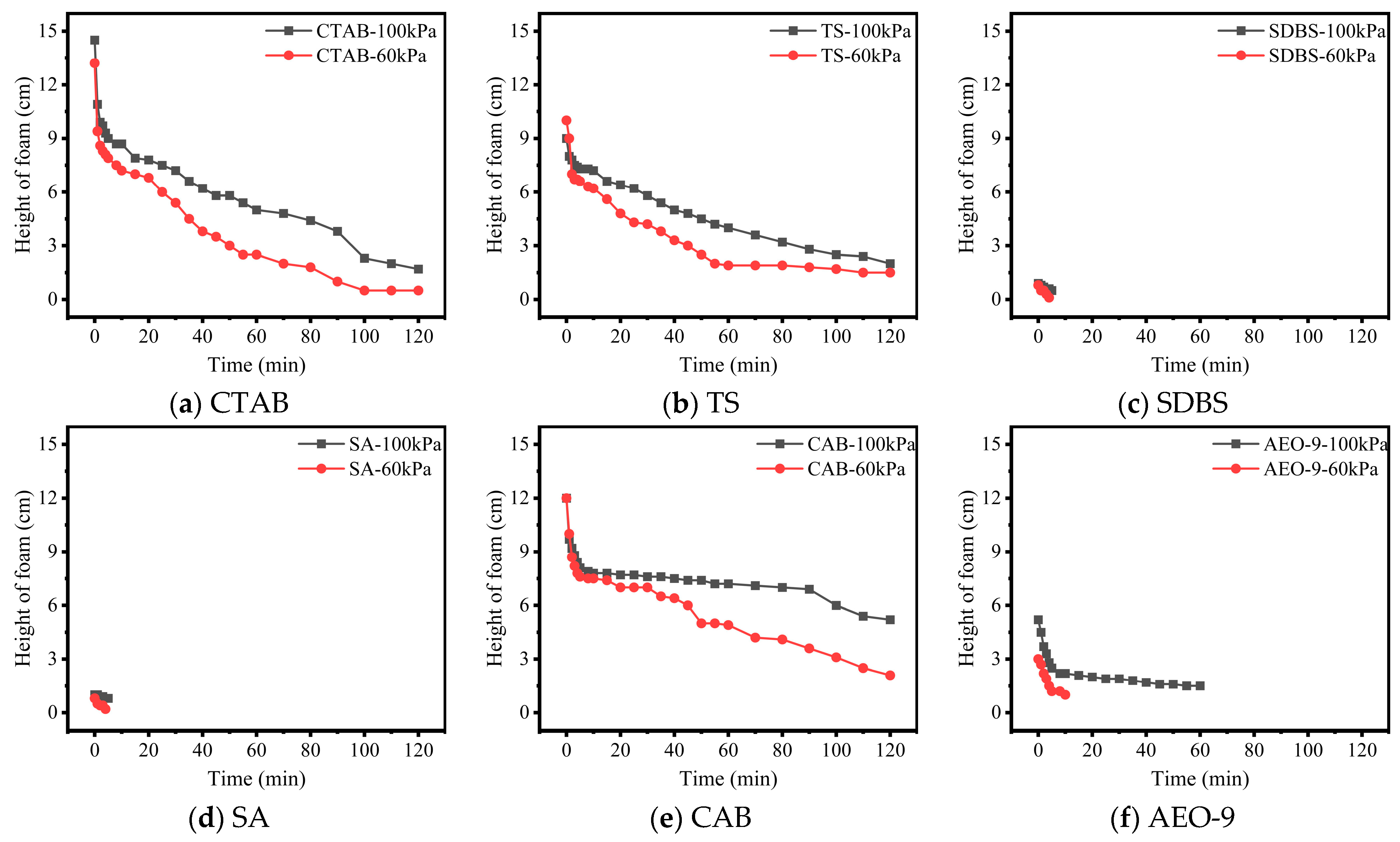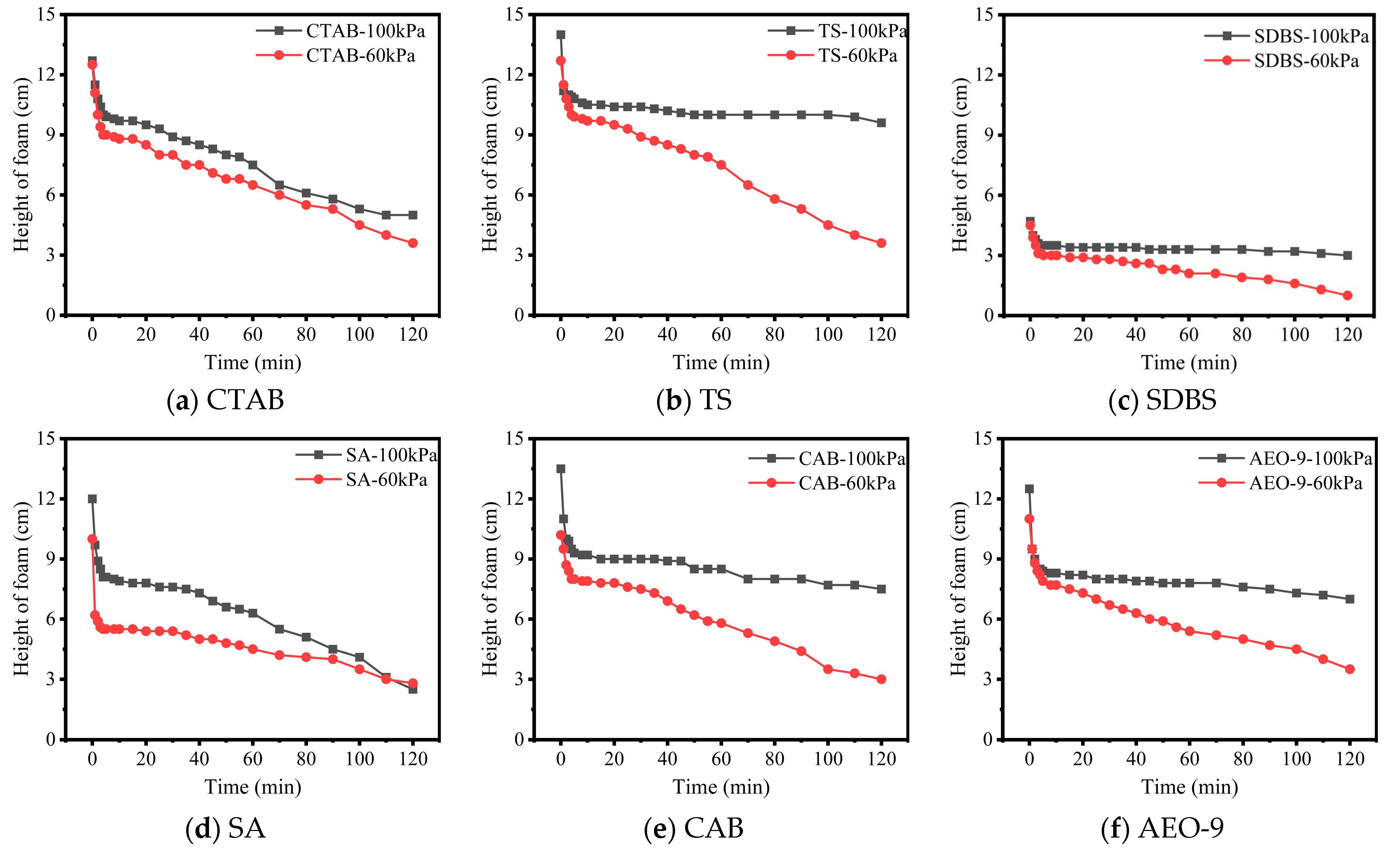 - Significant differences exist in the foaming capacity and foam structure of different AEAs under normal pressure. At 100 kPa in deionized water, the initial foam height and time-dependent stability of TS, CAB, and CTAB are generally superior to those of AEO-9, SA, and SDBS. In terms of foam morphology, TS and CAB can maintain a higher density of small bubbles and a slower coalescence rate.