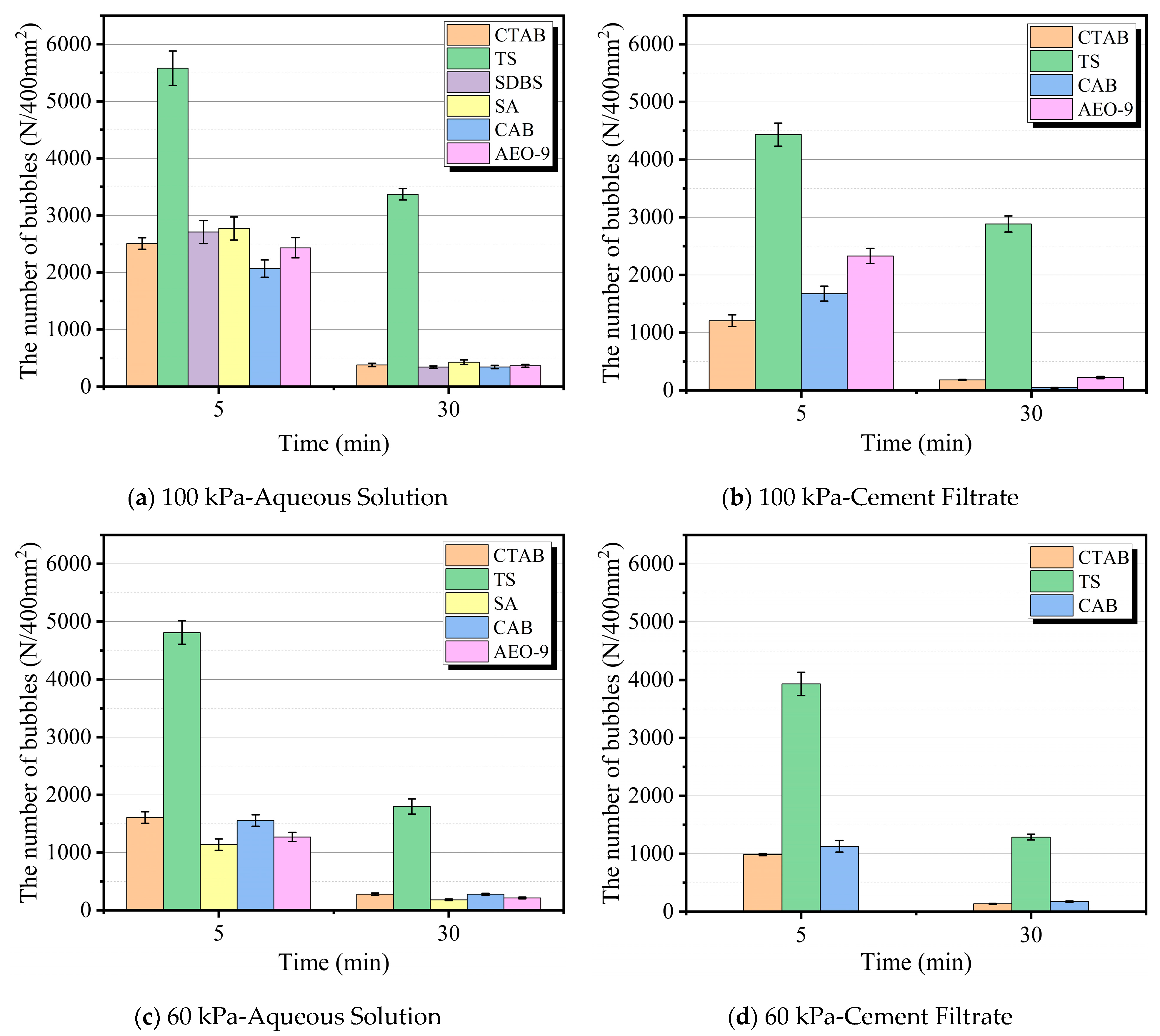 - The solution type significantly alters the foaming performance and stability of different AEAs. Amphoteric/saponin-based AEA systems exhibit greater tolerance to strong electrolyte and high-alkali environments and better inhibit drainage and coalescence. In cement filtrate, the foam height and foam stability of all systems decreased significantly compared to those in deionized water, with SDBS, SA, and AEO-9 being the most affected; TS, CAB, and CTAB showed relatively smaller reductions.