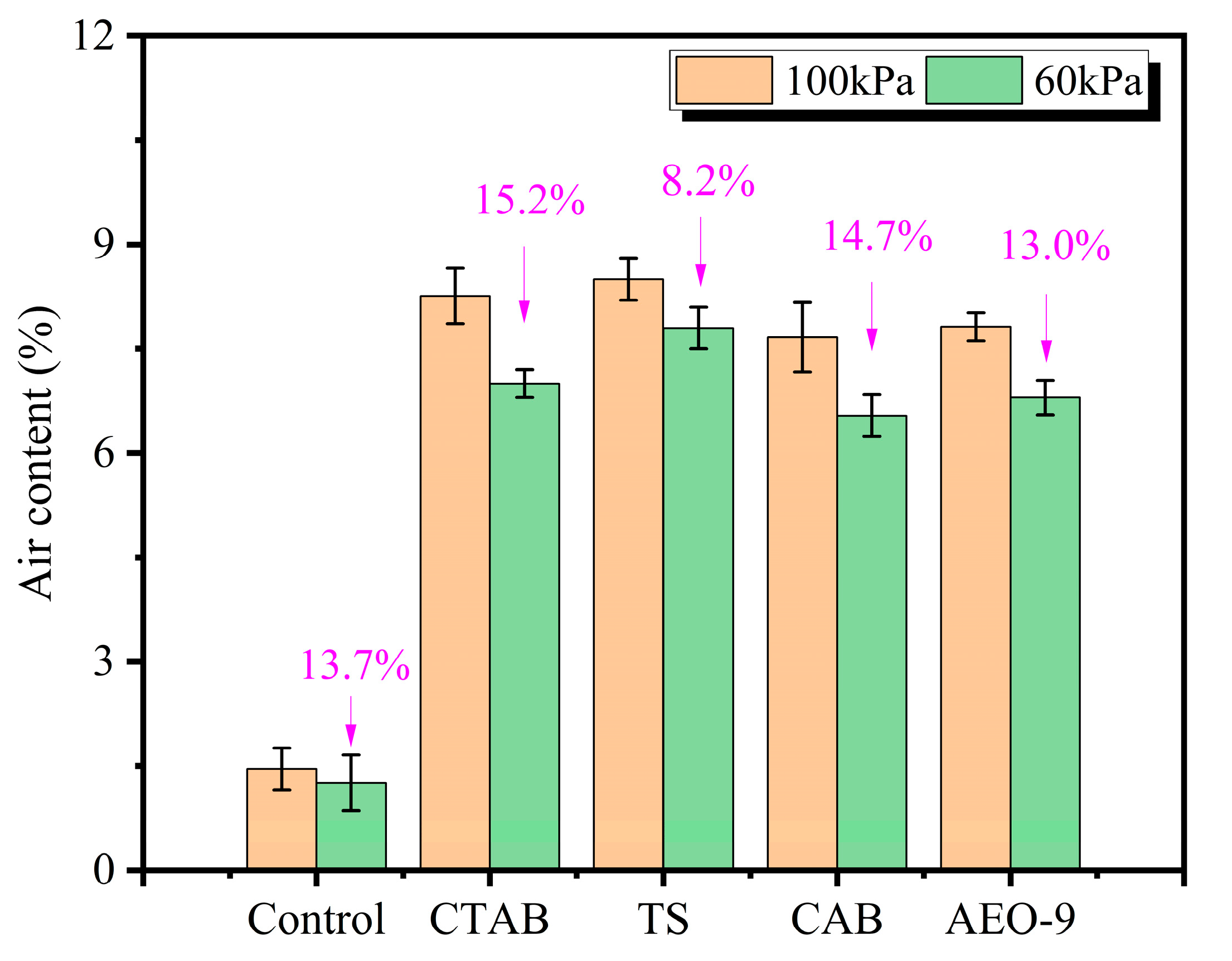 - A decrease in atmospheric pressure reduces the air content of mortar, but the extent of reduction depends on the type of AEA used. When the pressure decreased from 100 kPa to 60 kPa, the air content of the four air-entrained mortars decreased overall by 8.2–15.2%. Among them, the TS group had the smallest reduction (approximately 8.2%), while the CTAB group had the largest (approximately 15.2%).
