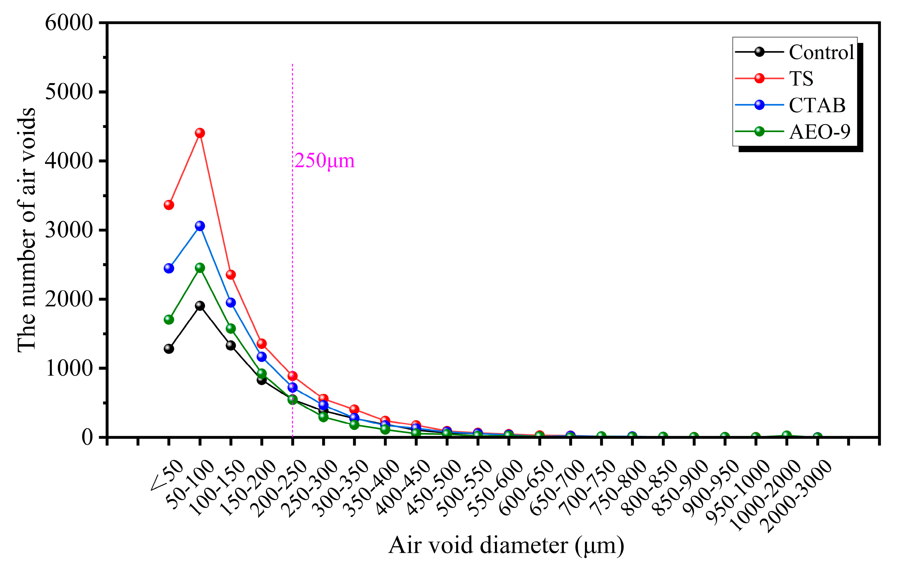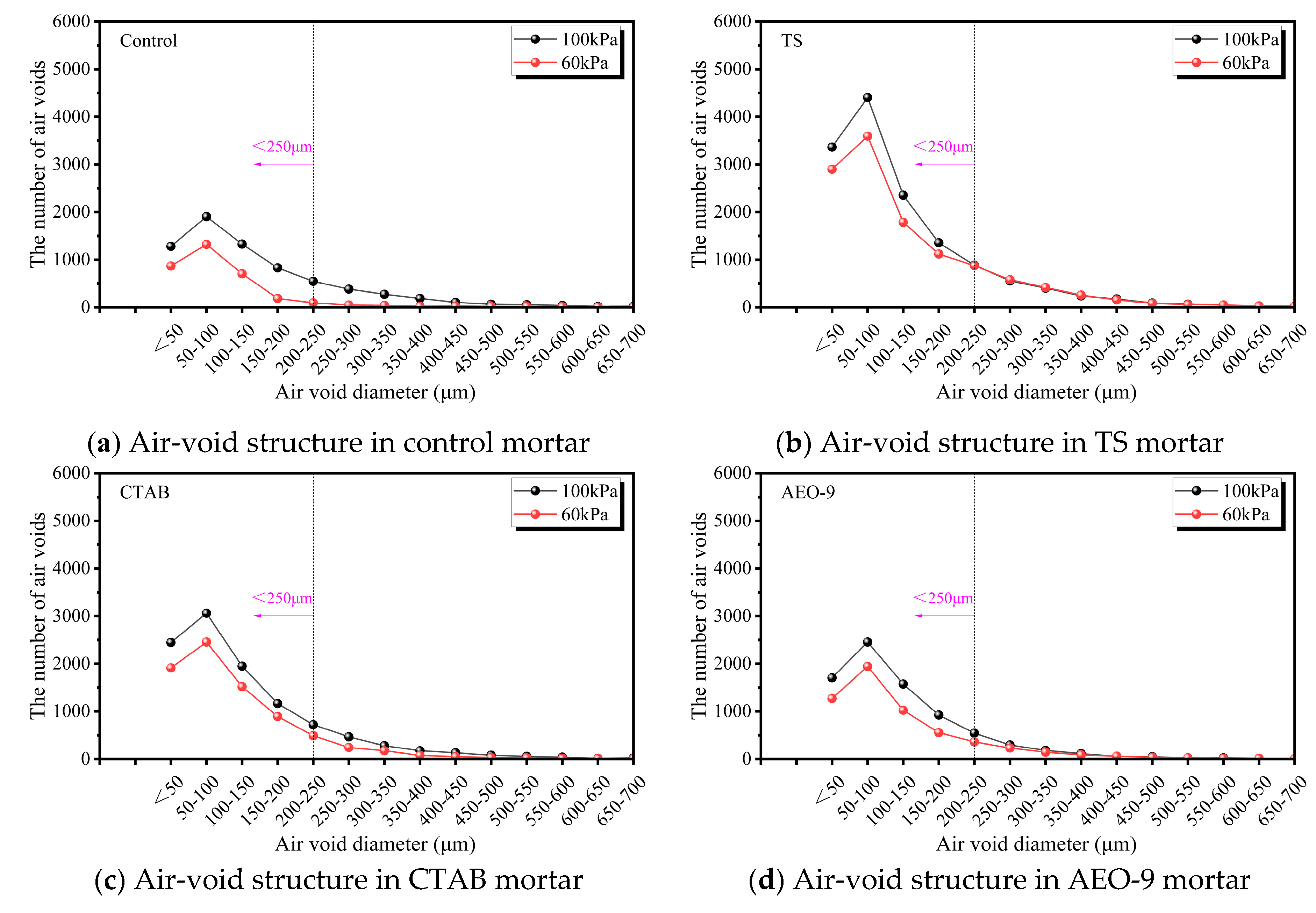 - The TS AEA possesses the best retention capability for fine air bubbles in cement mortar under low-pressure environments. At 60 kPa, the number of effective fine pores with a radius less than 250 µm in hardened mortar decreased compared to 100 kPa for all groups: the control, CTAB, and AEO-9 groups decreased by 51.48%, 25.64%, and 27.55%, respectively, whereas the TS group decreased by only 14.48%. TS not only generates a higher density of small bubbles during mixing but also more effectively suppresses coalescence and coarsening under low pressure and strong electrolyte conditions, making it most suitable as an air-entraining agent for plateau concrete.