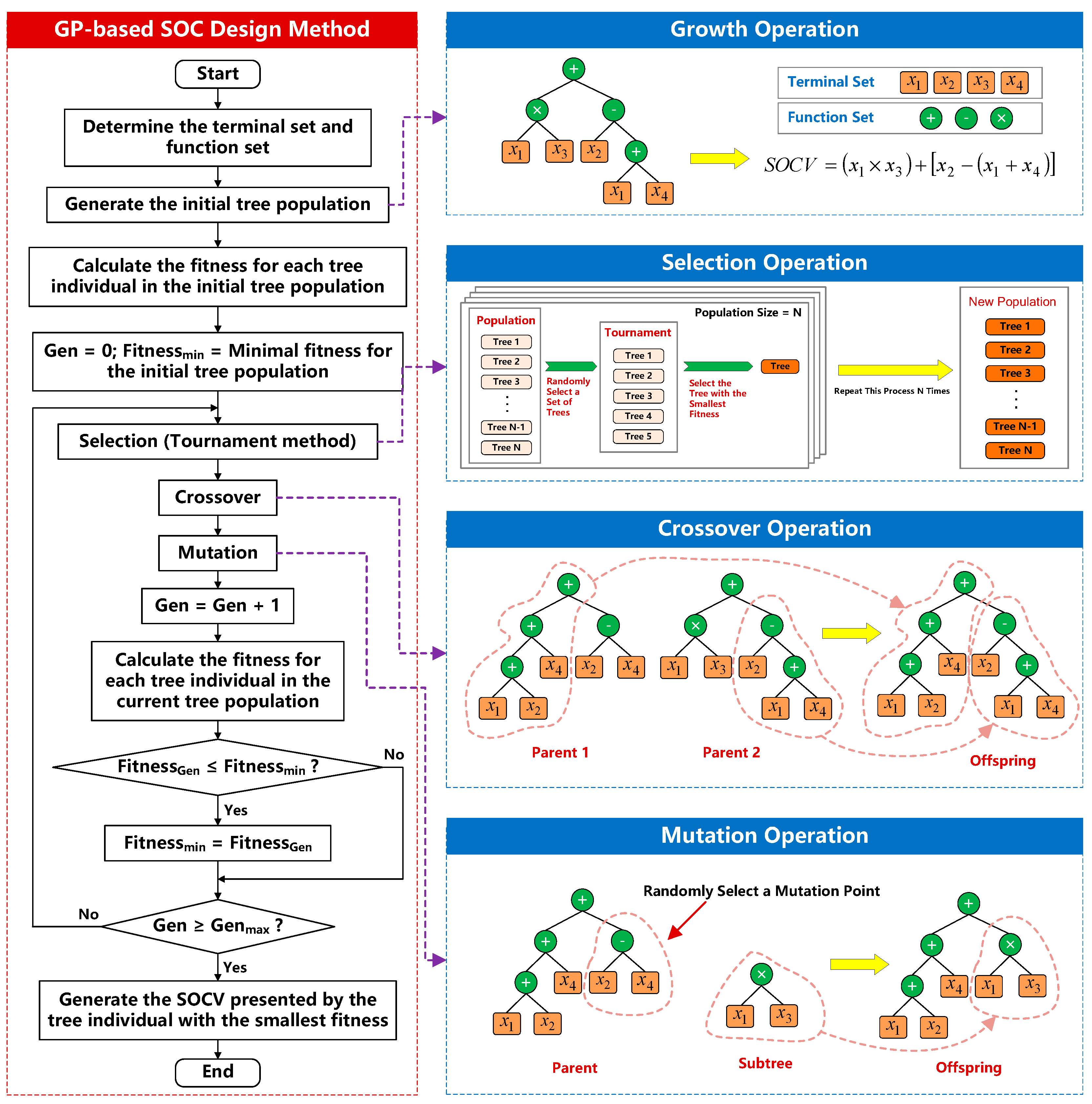 Employing the GP-based method to search for the SOCV for the , the terminal set is set to the sensitive stage temperatures corresponding to the , , , and , i.e., , , , and . Compared with the conventional SOC scheme CS-II, this setup does not require additional sensors, thus having stronger engineering practicability. The function set only includes the three arithmetic operations, i.e., addition, subtraction, and multiplication, to cover common linear and simple nonlinear combination forms in SOCV design, and division is excluded to avoid numerical instability caused by small denominators. The algorithm parameters are configured as follows: population size of 60, maximum number of evolutionary generations of 50, crossover rate of 0.6, and node mutation rate of 0.1. This parameter combination is determined through multiple rounds of independent optimization runs, aiming to balance search efficiency and solution diversity, ensuring that the algorithm can effectively explore the entire solution space and avoid falling into local optima.