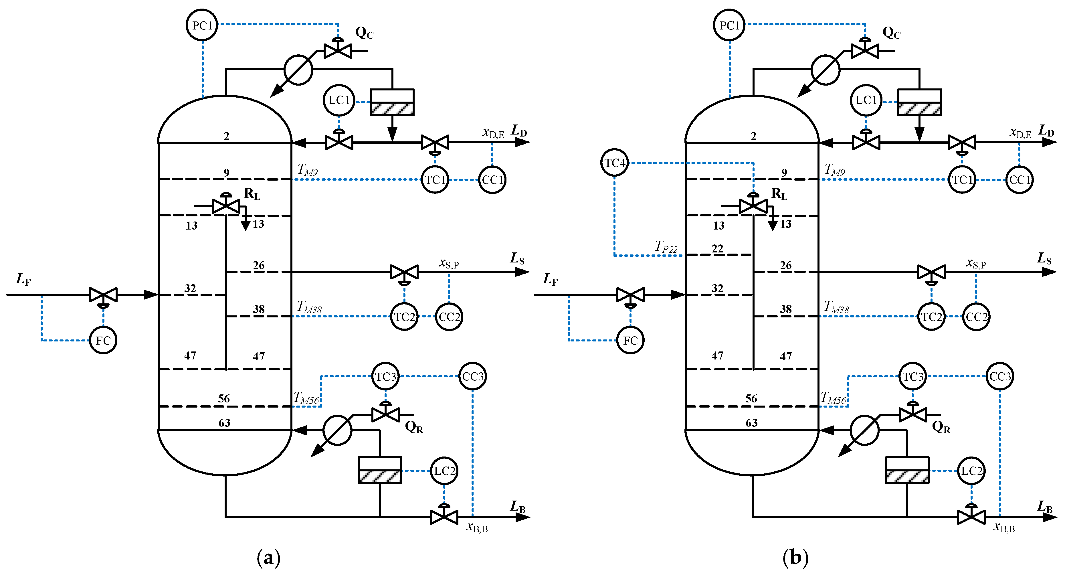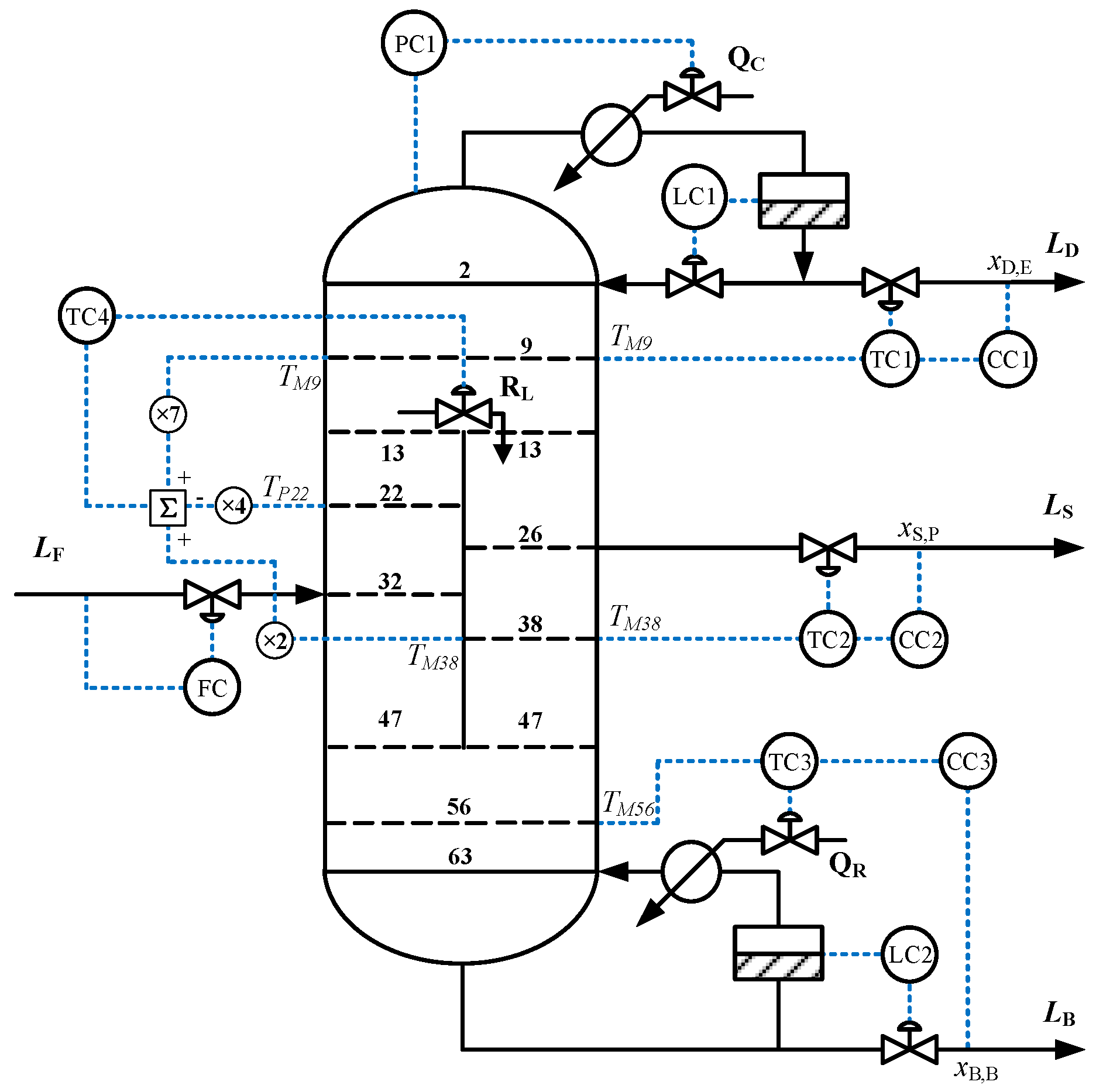 The basic control objective of EPB DWC is to ensure that the purities of the top, side stream, and bottom products meet their specifications. Except for the manipulated variables that must be used to maintain the feed flow rate, top column pressure, reflux drum level, and column bottom level, there are a total of four manipulated variables available in the EPB DWC for achieving this basic control objective, which are the distillate flow rate