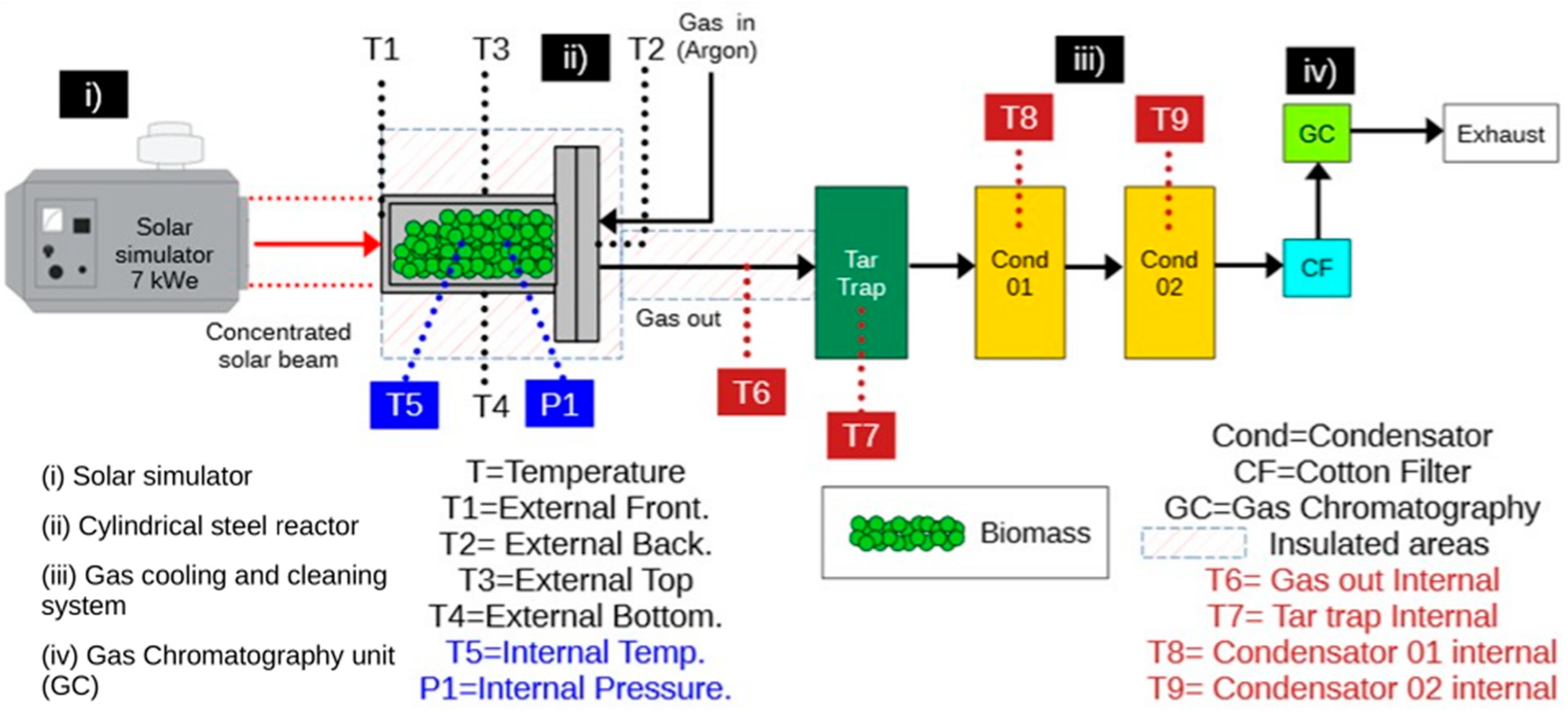 Figure 1). Thermocouples T1 and T2 measured the external surface temperatures of the reactor front (irradiated) and rear faces, respectively. Thermocouples T3 and T4 recorded the external surface temperatures at the top and bottom of the reactor. Thermocouple T5 was positioned inside the reactor in direct contact with the biomass bed to measure the internal bed temperature. Thermocouple T6 measured the temperature of the pyrolysis gases at the reactor outlet, while T7 was located inside the tar trap to monitor the condensation temperature.