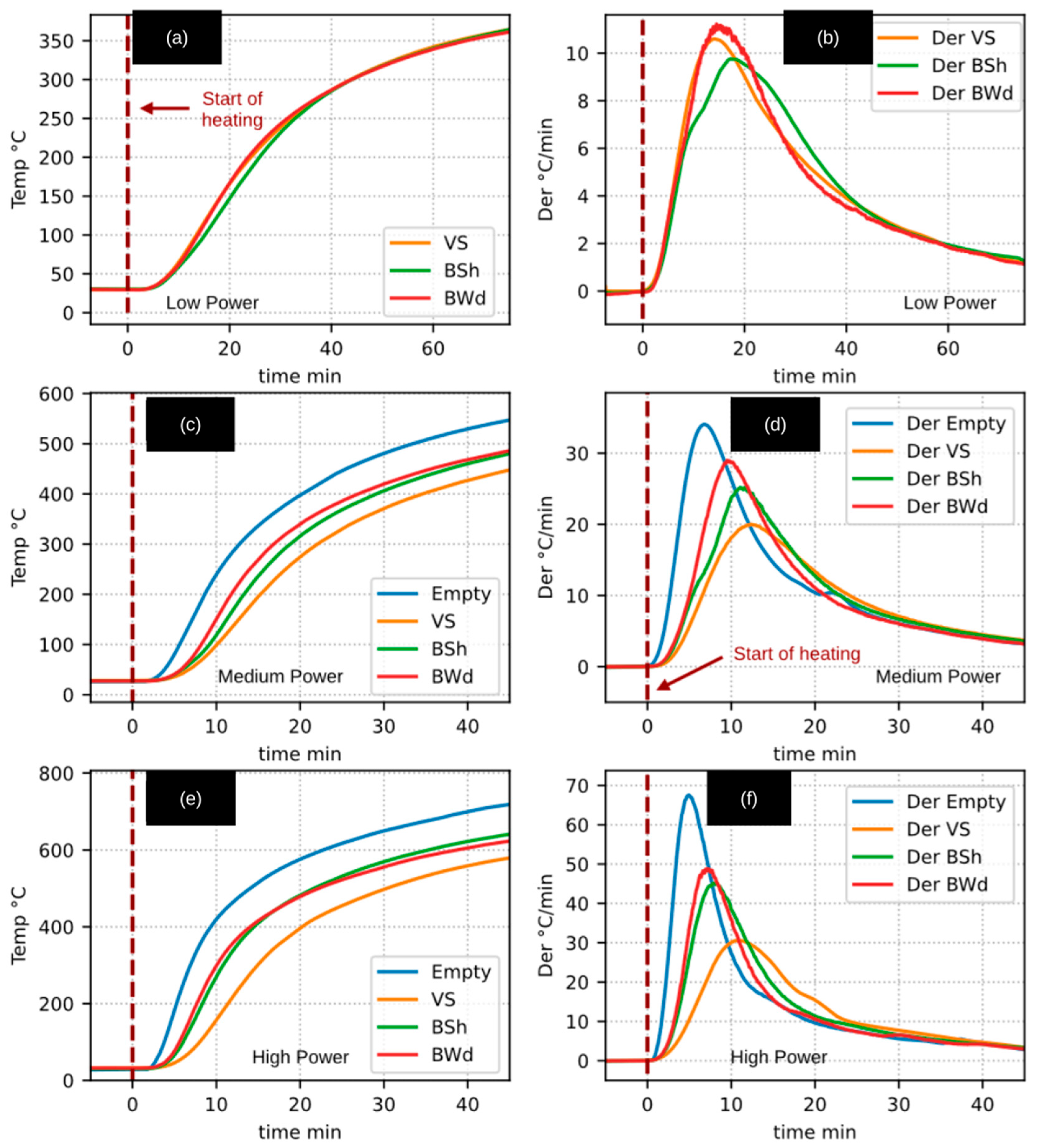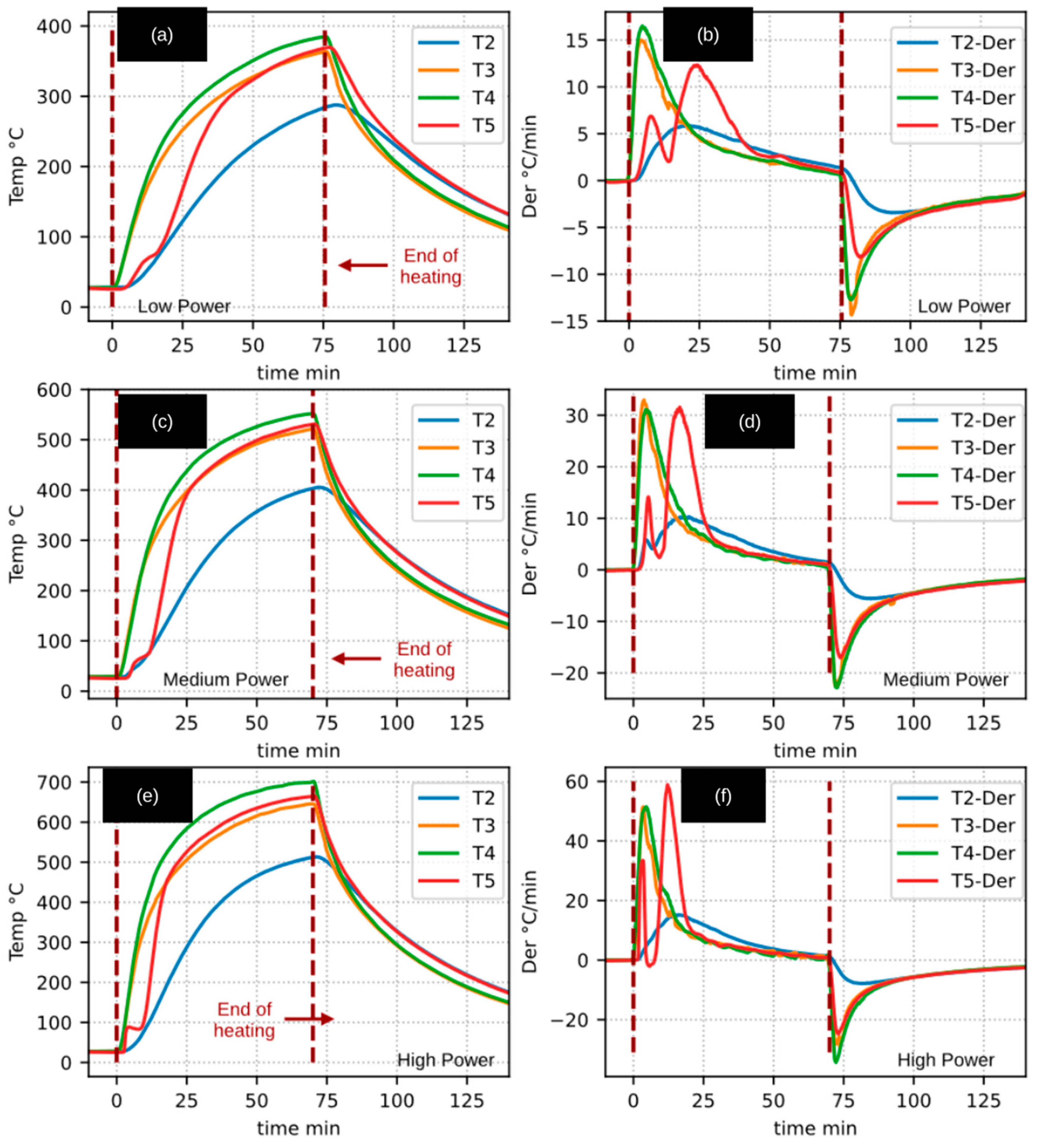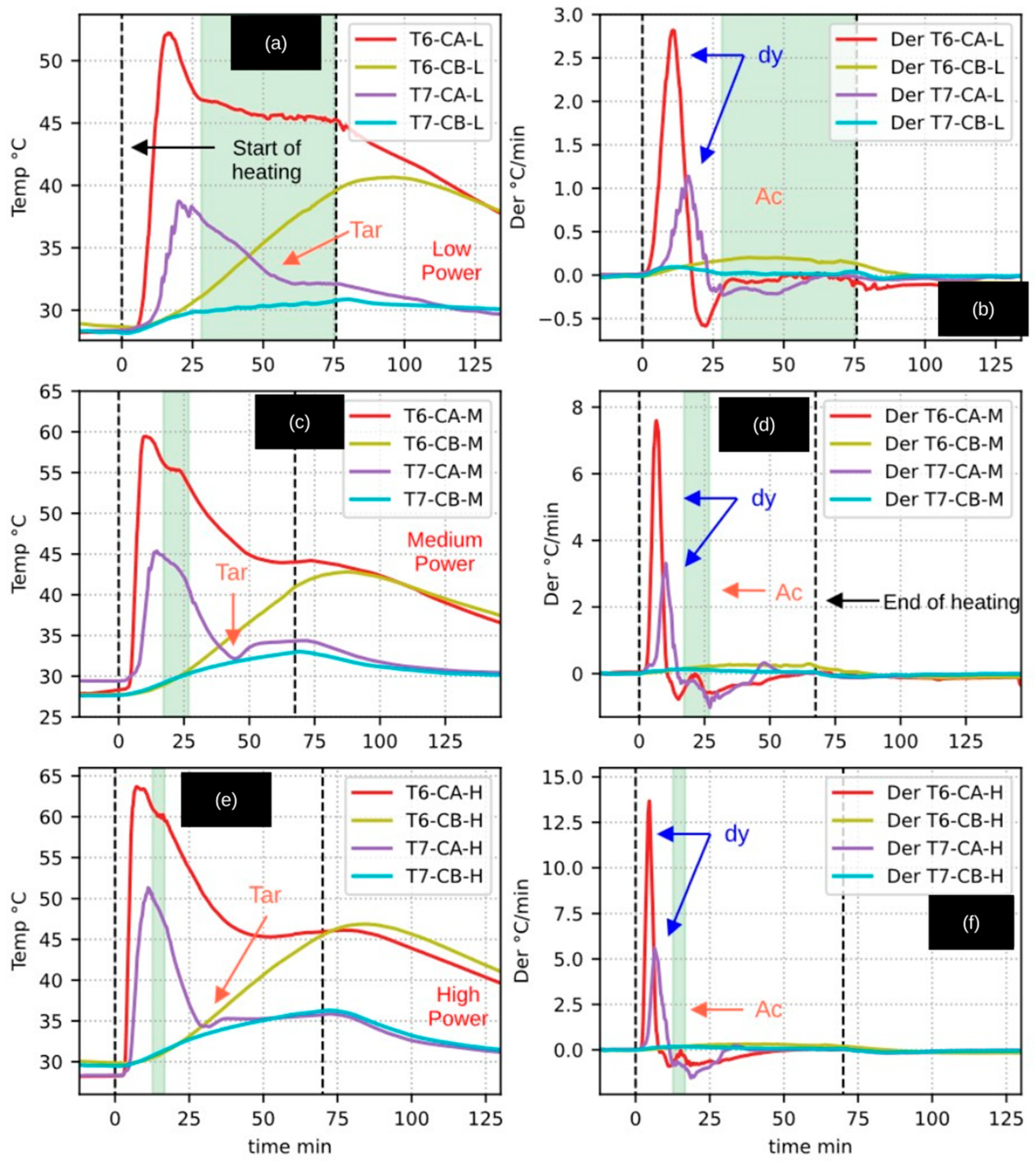 The data analysis methodology was based on the evaluation of heating rates derived from the temperature–time profiles, expressed as first-order derivatives (dT/dt). This approach constitutes a key element of the improved methodology adopted in this study, as it allows the temperature-variation signal to be accentuated and facilitates the identification and differentiation of the various stages of the pyrolysis process.